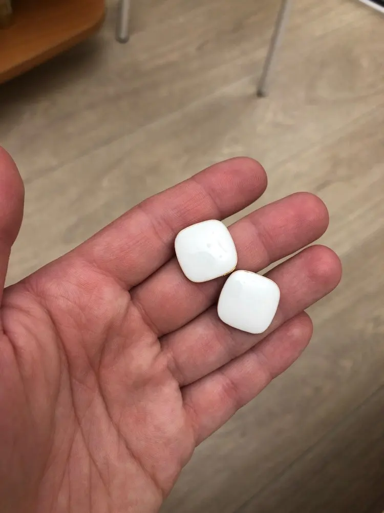 Отличные сережки, сделаны аккуратно, очень продуманная упаковка продавца(контейнер и пузырчатая пленка внутри контейнера)- сломать невозможно, брак может быть лишь при упаковке и отправке товара, эмаль без царапин, гладкая , размеры 1,5*1,5см. За свои деньги _ великолепно!