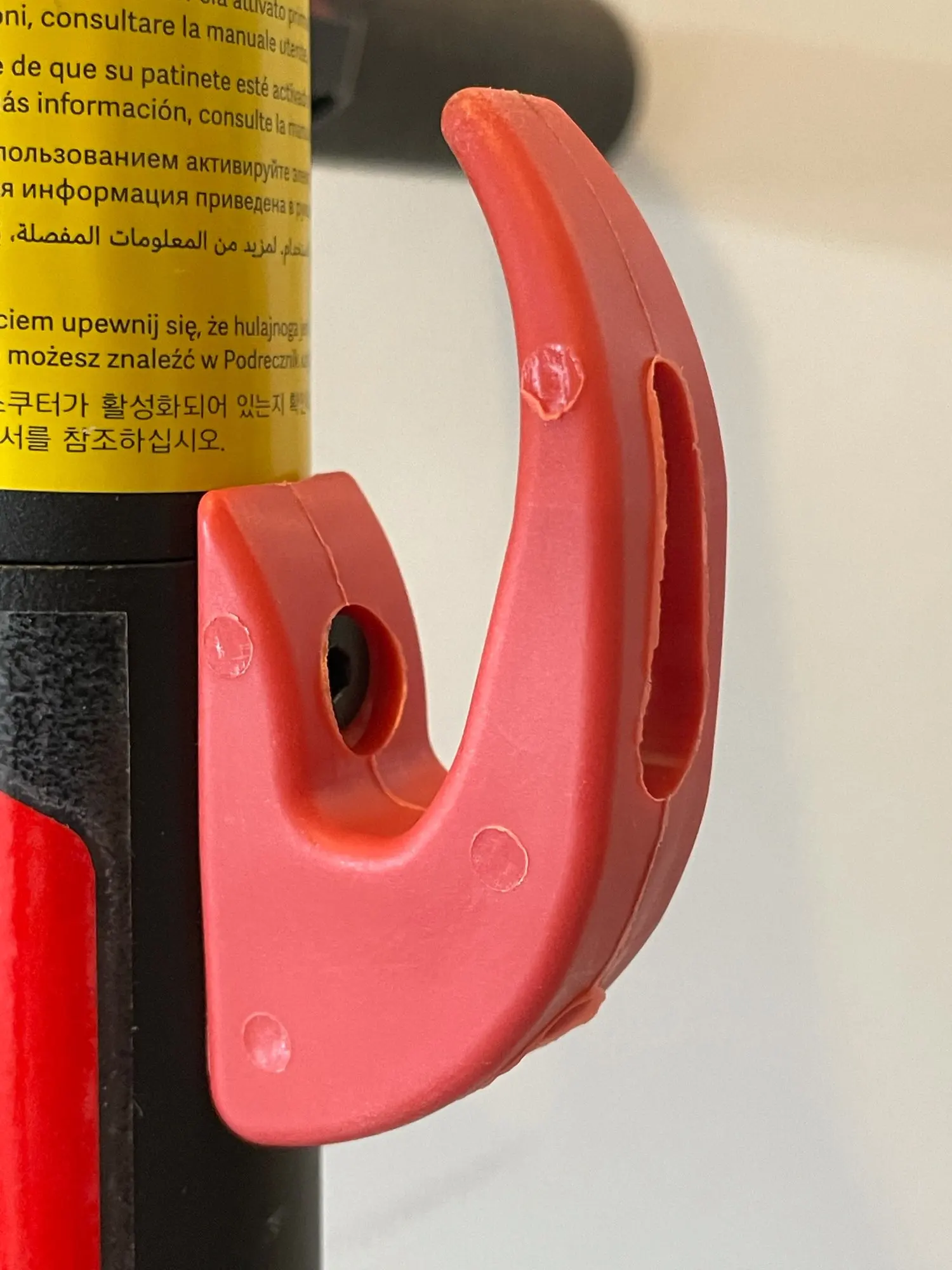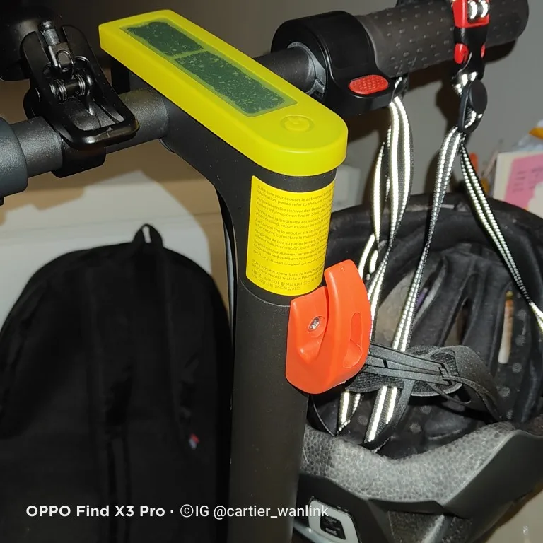 Crochet rouge pour Xiaomi M365 (Pro 2 pour moi), totalement compatible, facile à installé (livré avec vis et clé Allen). Il va permettre d’accrocher sac, casque, etc. Point négatif: le crochet n’est pas lisse, il a plusieurs rugosités. Dommage.