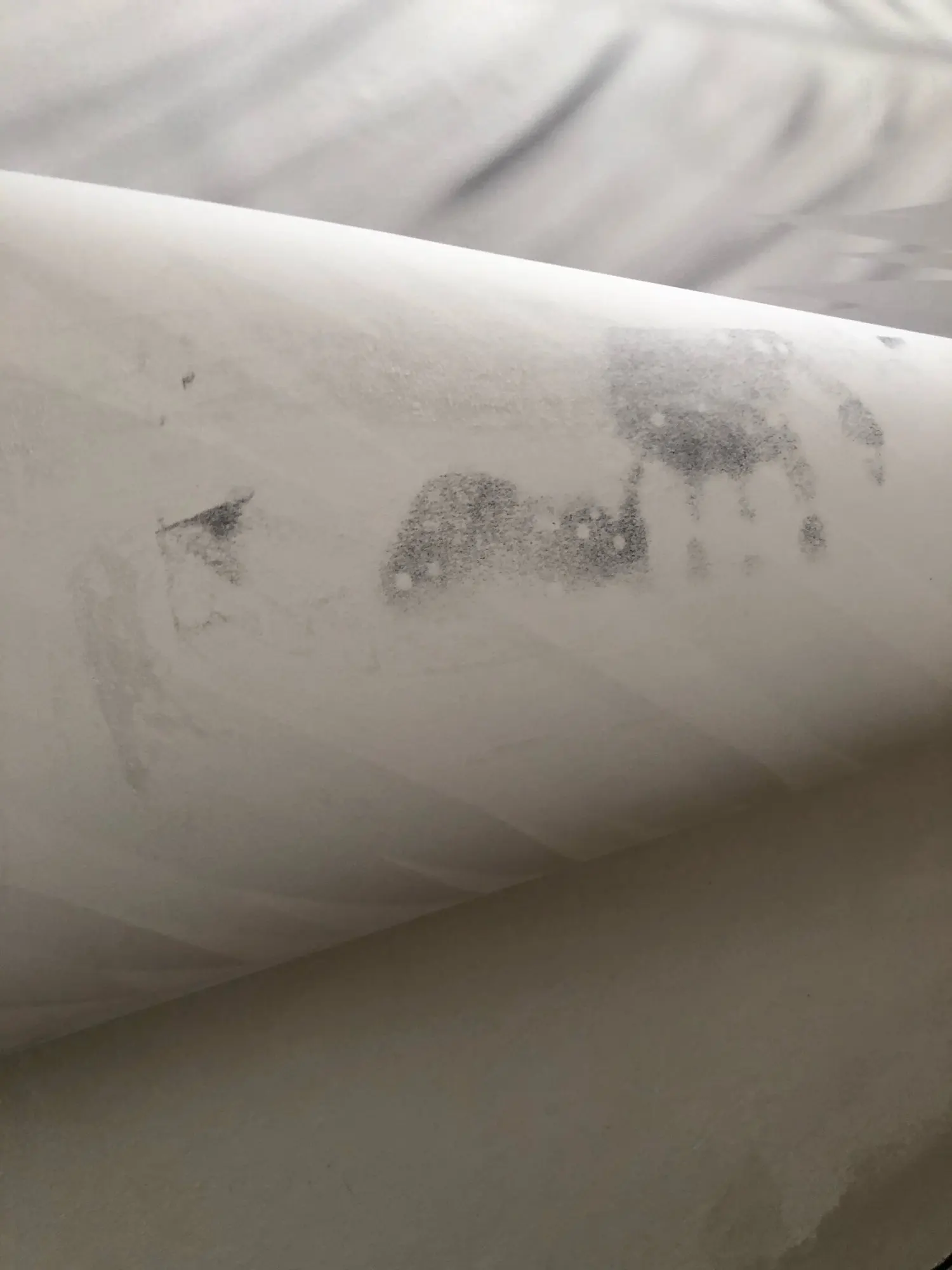 Мятая холст и пятно чернил на белой части холста, которое будет видно при установке