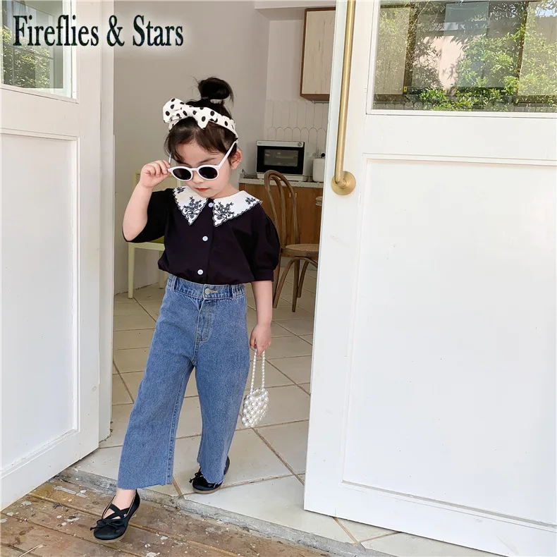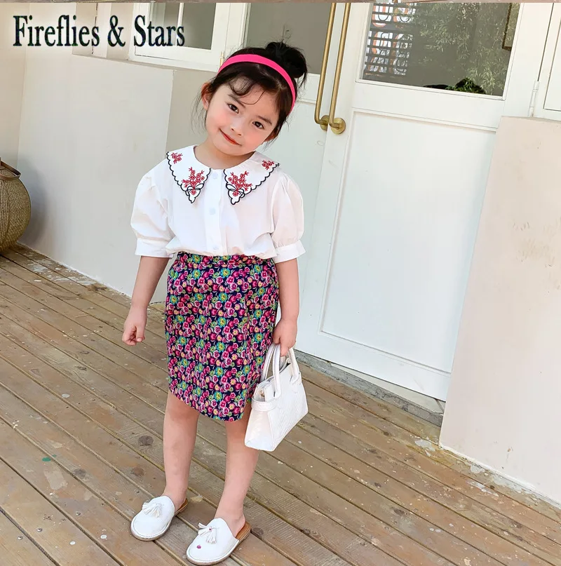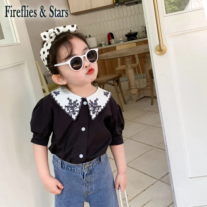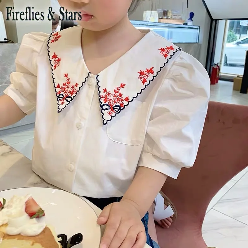 Летняя блузка для девочек, детские Рубашки, Топы, Детская уличная одежда, модная вышивка, v-образный вырез, пышные рукава, ins 2-7 лет