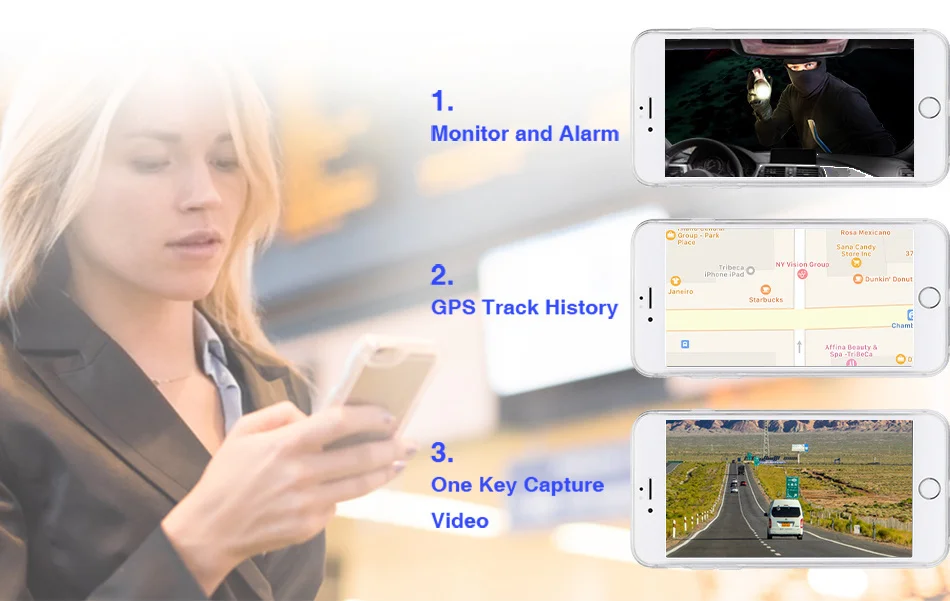 -1 х DVR-1 х Руководство пользователя-1 х USB кард-ридер (подарок)-1 x камера заднего вида 1080P с кабелем 6 метров-1 х понижающий линии в течение 24 ч наблюдение за парковкой-1 х GPS модуль