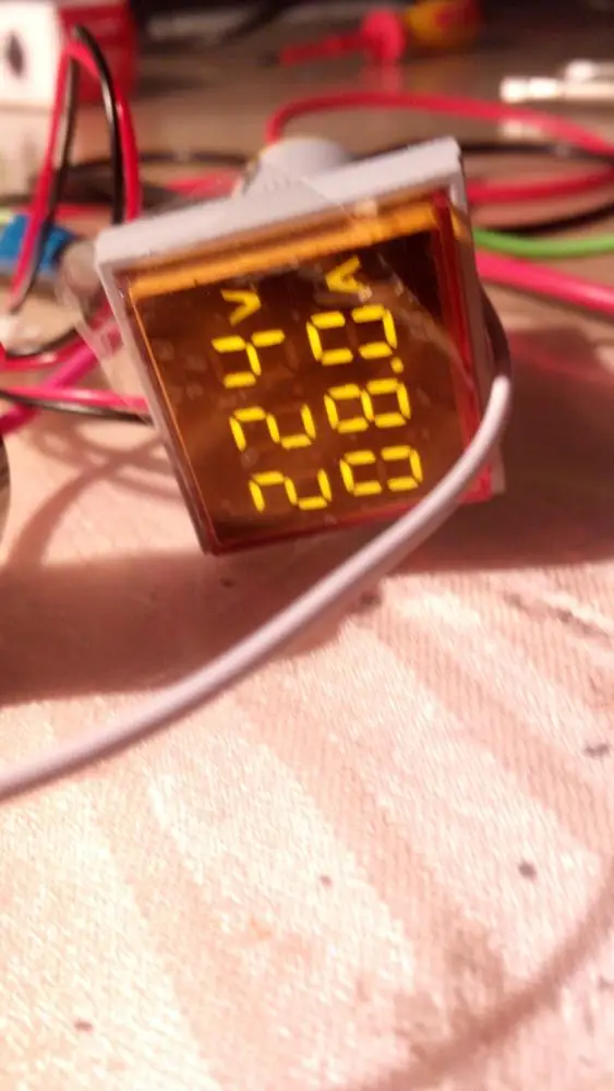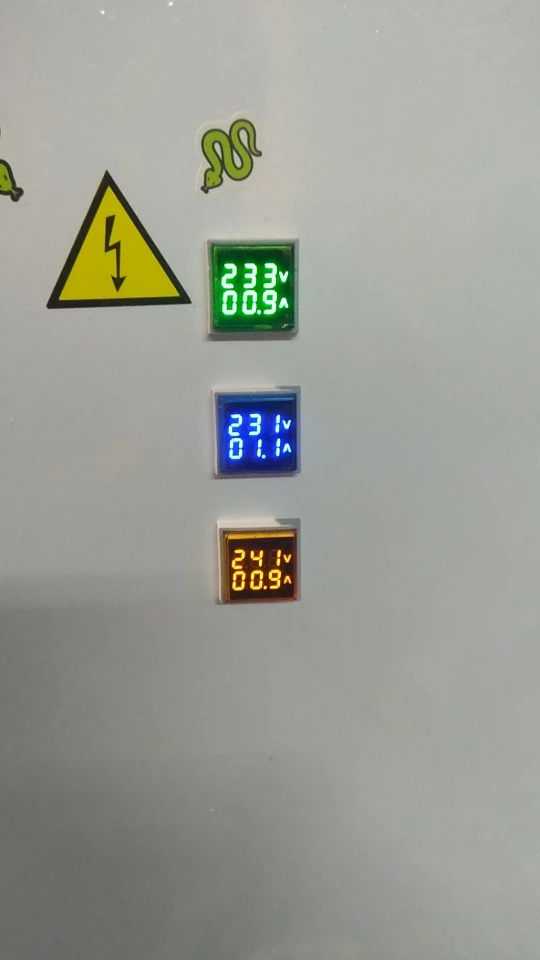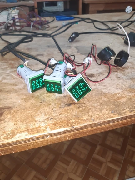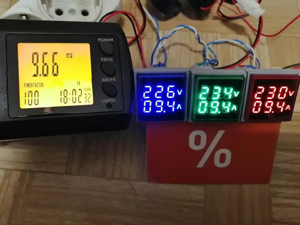 Заказывал три индикатора разного цвета - на 3 фазы. Внешне вполне прилично выглядят, однако точность измерений оставляет желать лучшего: напряжение от 2,3% до 6% все занижают (особенно отличился синий), у всех трех разные значения; ток чем меньше, тем больше погрешность, 5А - 6%, 9А - 3%, тоже все занижают, но показания одинаковые, ниже 0,5А не видят - на индикаторах нули. Все видно на фото. Буду пытаться исправить ситуацию... С током попроще - можно добавить витков на датчики, а вот с напряжением потребуется лезть внутрь...