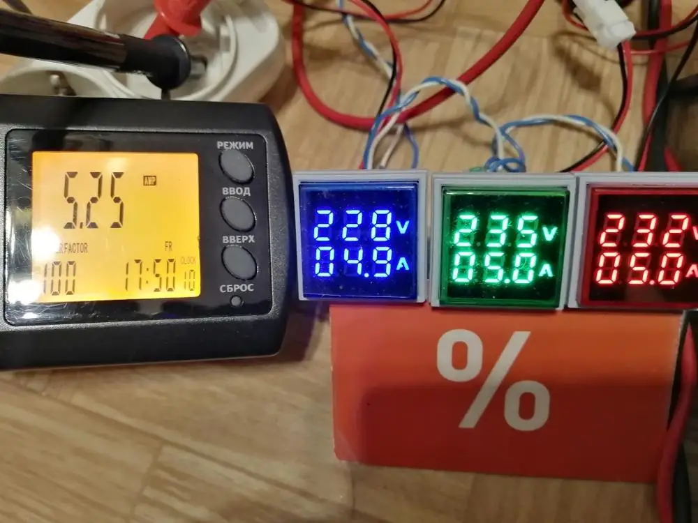прибор немного подбрёхивает. на 225 роказывает 205 разница мтабтльные 18-19 вольт по току особо тестировать нетестироаал, брал прибор как индикатор наличия потребленя нагрузки и наличия напряжения питания для нагревателя в бочку. однозначного ответа нет у меня