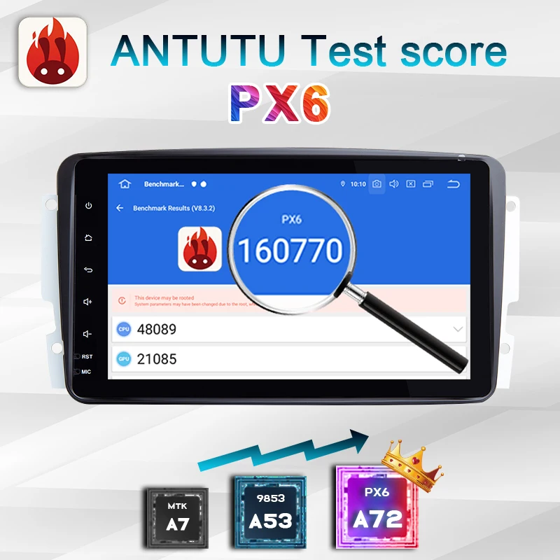 PX6PX6 является лучшим чипом на рынке в настоящее время, он работает быстрее, чем все другие типы. Балл ANTUTU составляет 160770, что лучше 7853 4G + 64G, PX5 и всех других типов 4 + 64G на рынке. По сравнению с другими радио типа fo, PX6 radio может загружать больше видов приложений android с android market, и приложение может работать лучше.