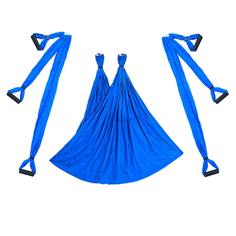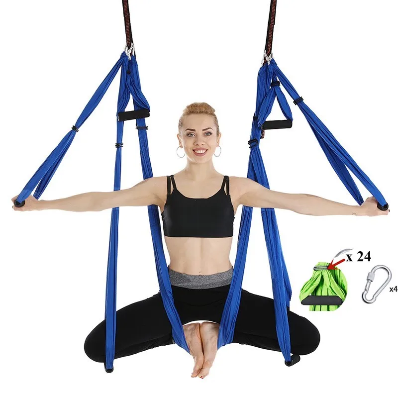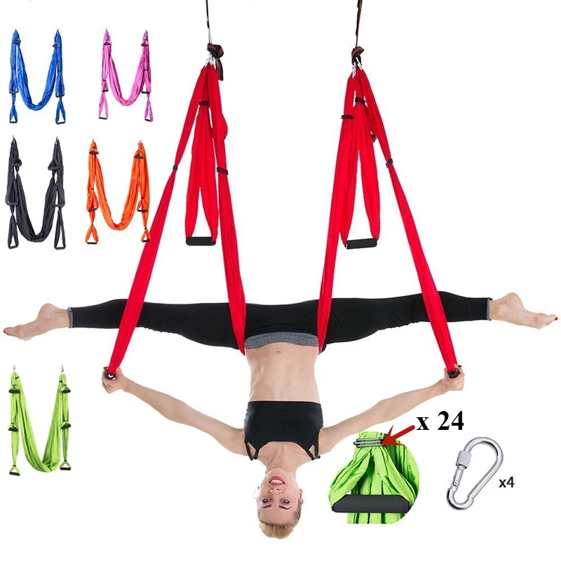 Название продукта: гамак для йоги Тип: 6 ручных ручек Цвет на выбор: королевский синий, зеленый, оранжевый, розовый, черный, красный Материал гамака: Парашютная ткань (210T нейлоновая тафта) Материал дужки: 201 нержавеющая сталь Грузоподъемность: 200 кг Размер: прибл. 250х145см Аксессуары: 1 главный гамак, 6 ручных ручек, 4 скобы, 24 регулировочных пряжки, 1 сумка для хранения