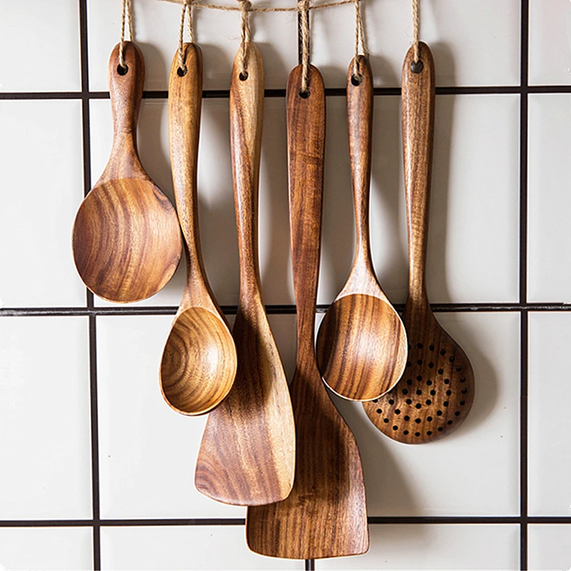 Набор кухонных принадлежностей натуральное тиковое дерево, шпатель, ложка, дуршлаг, шумовка для супа, ложка, ложка, набор кухонных принадлежностей