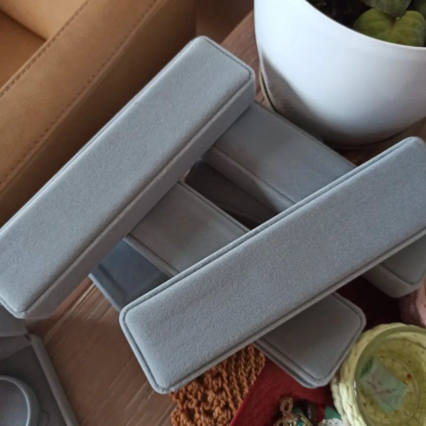 Коробка не открывается так, как на фото, верх тяжелее основания, коробка поворачивается, а не для сидения на плоской поверхности, постоянно поворачивается, не имеет стабильности, чтобы оставаться на витрине. Подкладка из клейкой бумаги, а не из бархата.