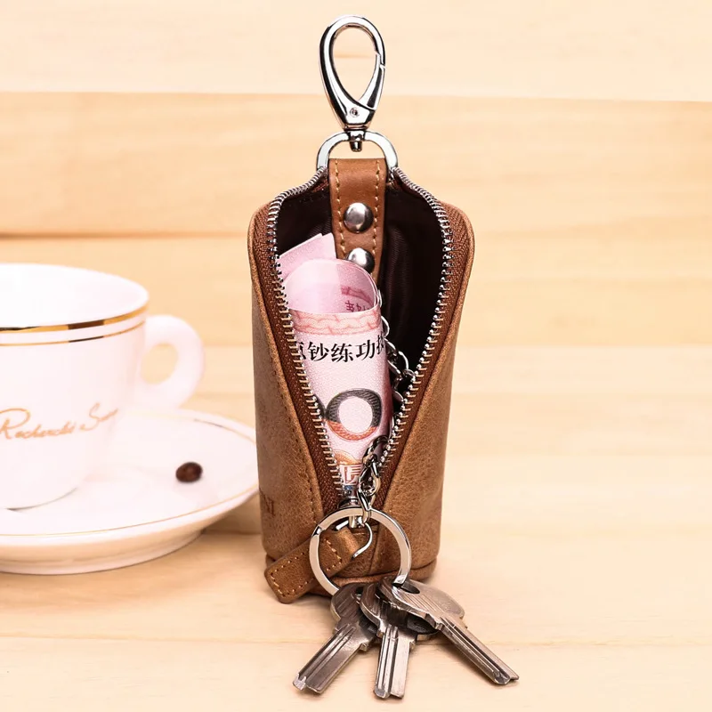 Винтажный чехол для ключей из натуральной кожи для мужчин и женщин, сумочка из воловьей кожи на молнии, поясной кошелек для ключей с прицепом, монетница