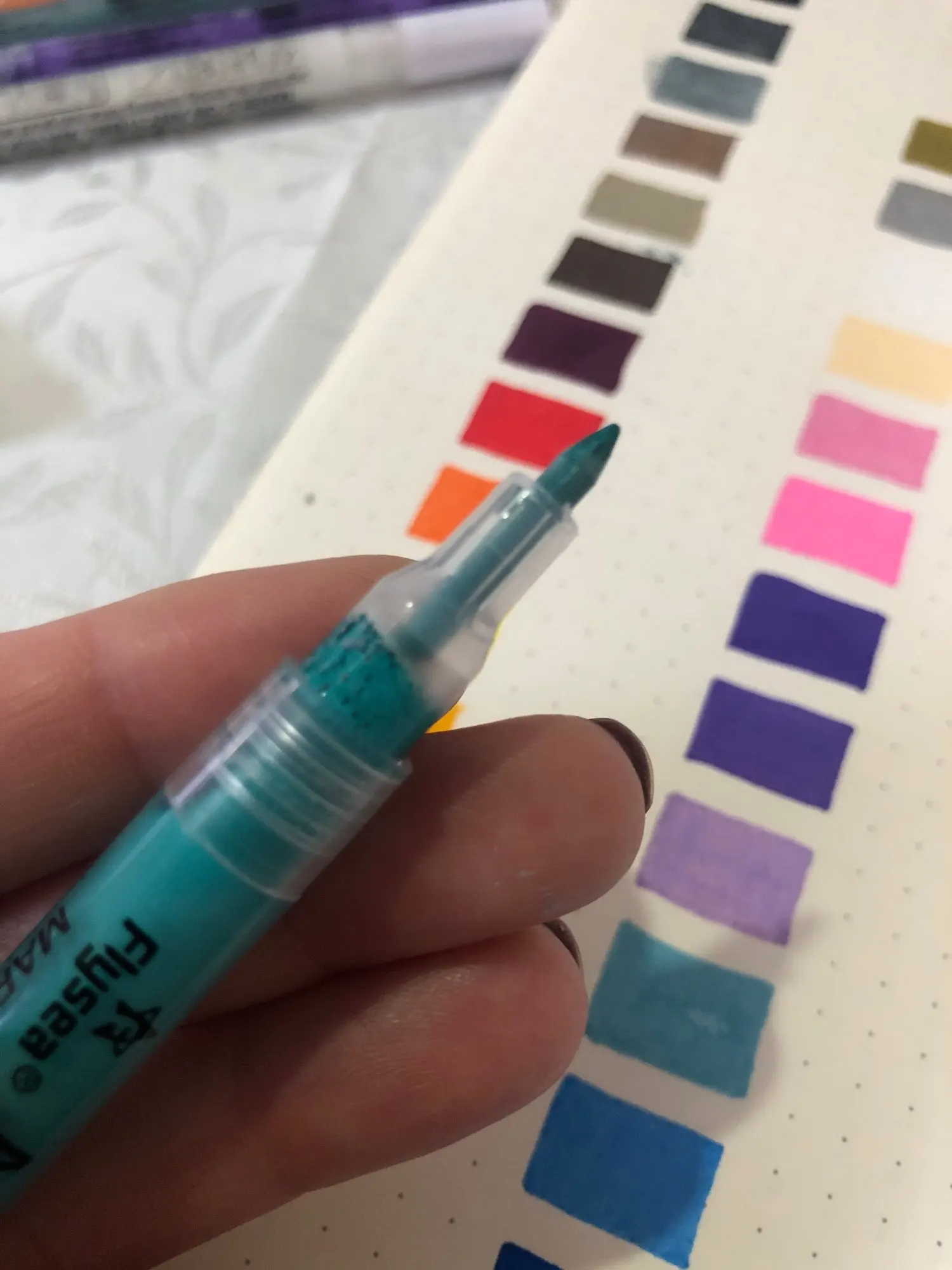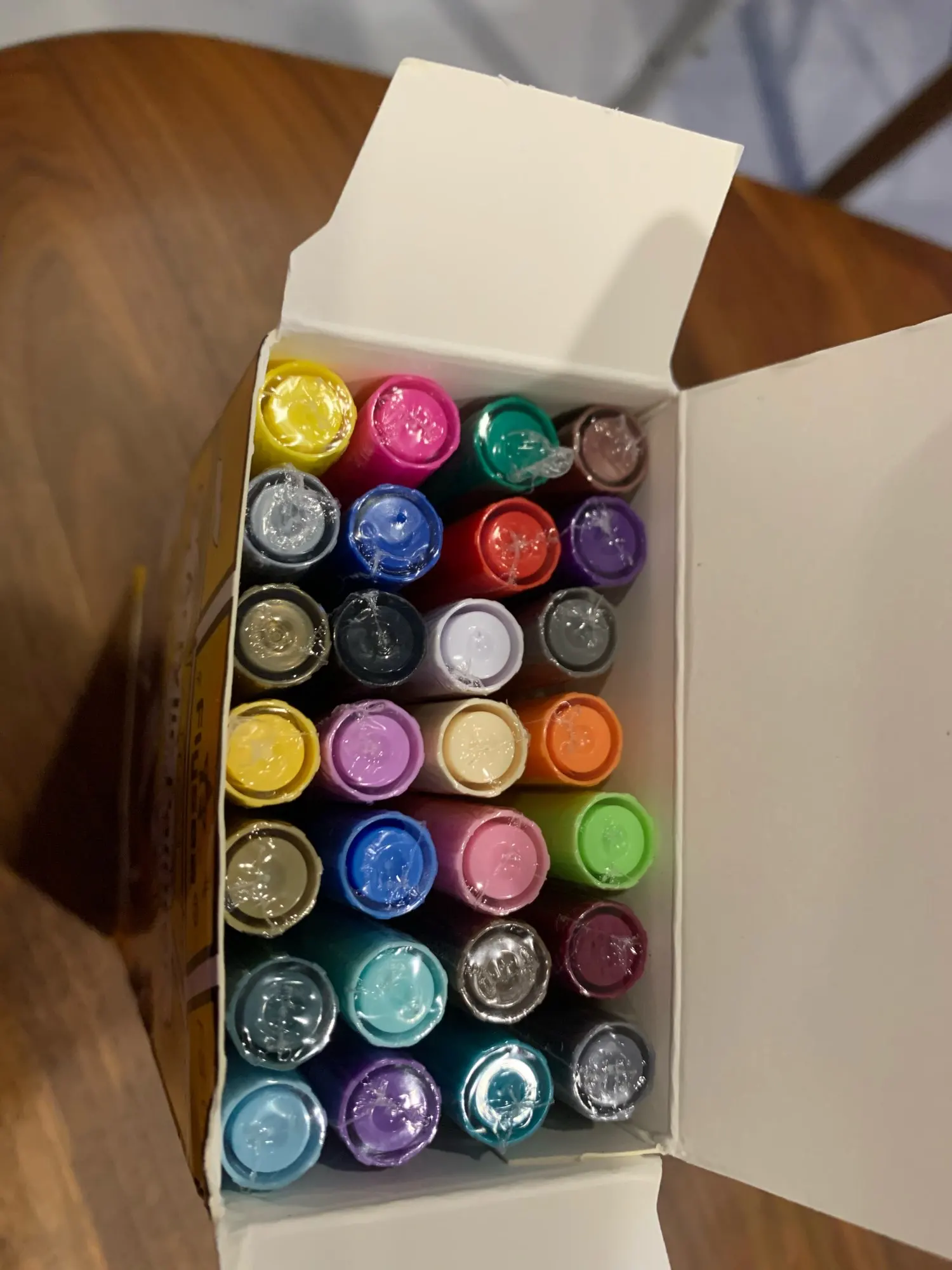На первый взгляд хорошие маркеры, плотные, хорошо кроющие. Легко открываются - это плюс для детей или людей, у кого слабые руки. Для меня это было очень важно, и я это оценила. Доставка месяц. Спасибо!
