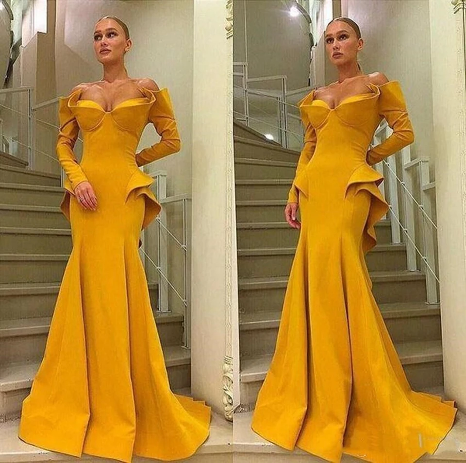 Золотисто-желтые атласные вечерние платья с длинным рукавом, Формал...
