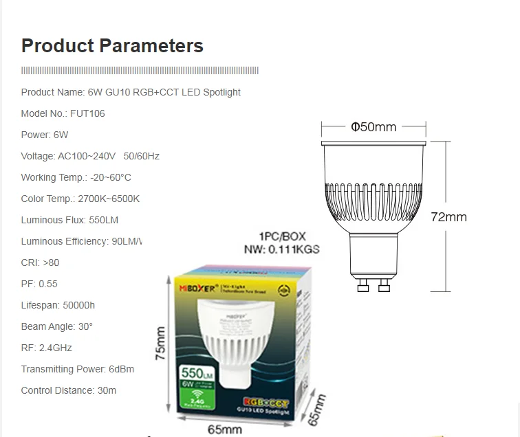 Светодиодсветильник лампа Mi light FUT106 6 Вт GU10 RGB + CCT MiBox...