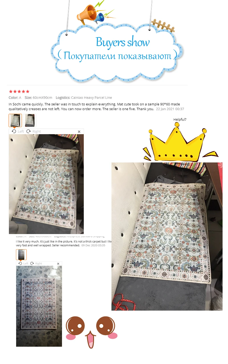 В: у вас есть реальные изображения?О: Да, если вы хотите просмотреть реальные фотографии, пожалуйста, свяжитесь с нами! Мы предоставим вам позже.В: Можно ли сделать заказ?Ответ: Да, если вам нужна Настройка, обратитесь в службу поддержки клиентовВ: не скользит ли он?О: Да, нижняя часть ковра-это нескользящее пластиковое дноВ: Если вам не понравился товар, как мне его вернуть?Ответ: если покупатель вернет товар в течение 15 дней после получения товара по любой причине, мы вернем деньги покупателю. Однако покупатель должен оплатить стоимость обратной доставки и убедиться, что возвращенный товар остается в первоначальном состоянии.В: какая логистика используется для доставки?О: товары отправляются по стандарту AliExpress, авиапочтой Почта Китая, экспресс-почтой AliExpress, ePacket и прибывают в большинство стран в течение 15-35 рабочих дней. Время доставки зависит от пункта назначения и других факторов, это может занять до 60 рабочих дней.Если вы хотите получить товары быстрее, пожалуйста, свяжитесь с нами, чтобы оплатить дополнительную стоимость доставки, мы можем предоставить вам следующие более быстрые и дешевые способы доставки: UPS, DHL, Fedex, TNT, DEPX, EMS. Таким образом, вы можете получить товар в течение 5-7 рабочих дней.