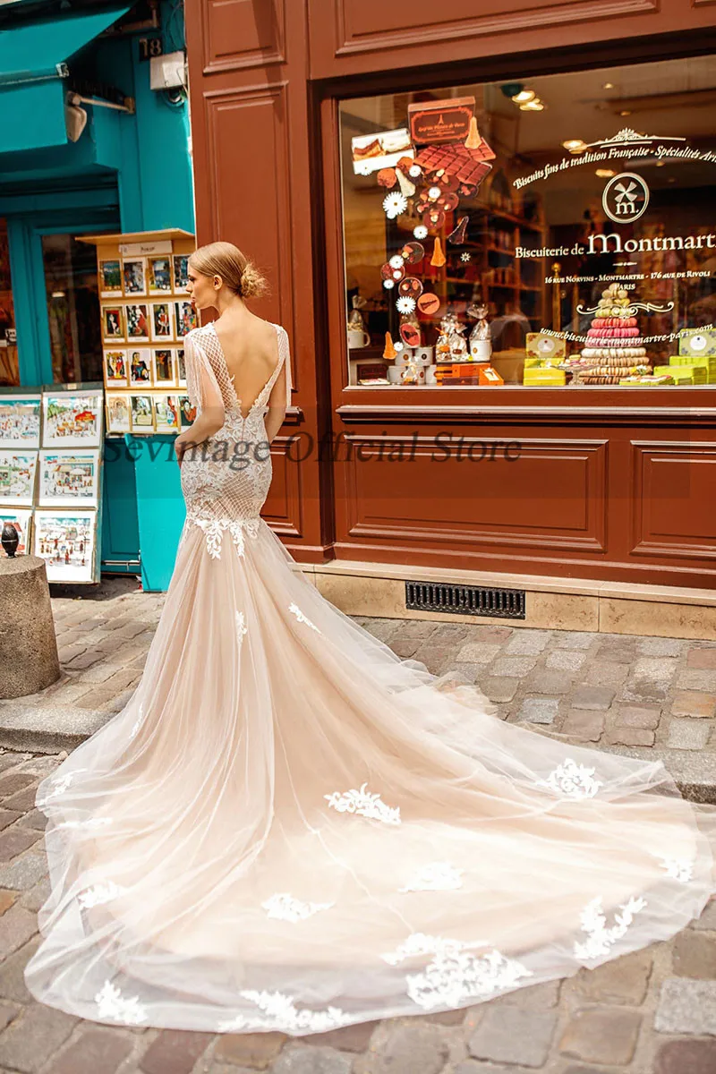 Sevintage Русалка длинным шлейфом для девочек; Платье в стиле бохо, свадебные платья водонепроницаемые Мокасины с бахромой и вырез, свадебные платья с кружевной аппликацией индивидуальный заказ; Обувь под свадебное платье для невесты 2021