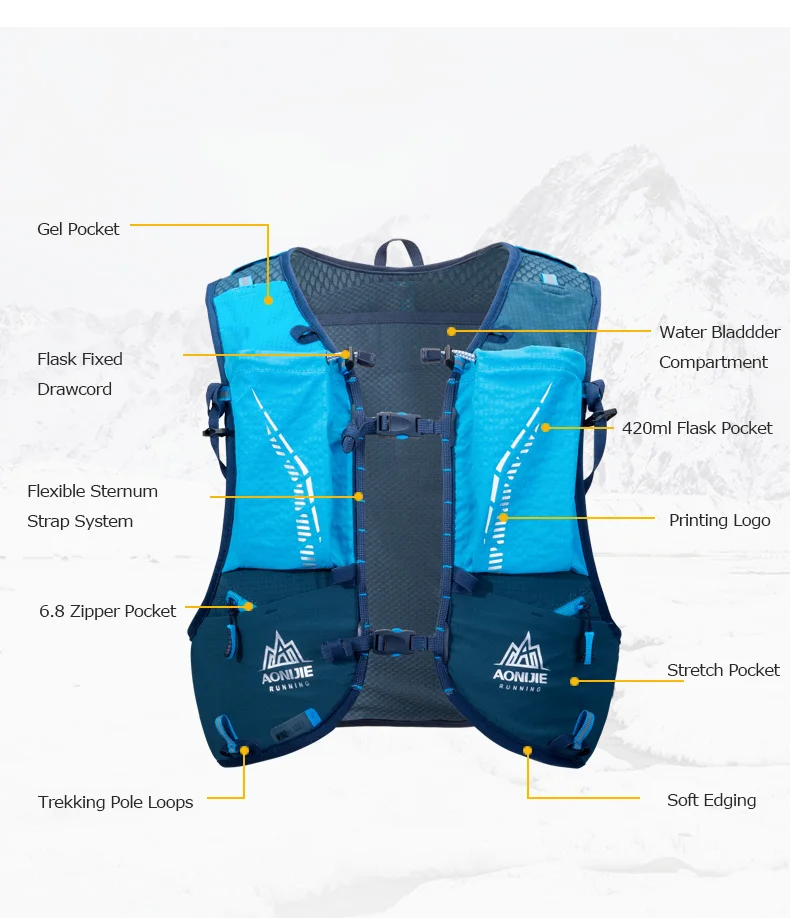 AONIJIE 18L гидратационный рюкзак:Свободно перемещайте и переносите все необходимое на день по следу.Отправляйтесь на пробежку в течение всего дня или в технический поход: рюкзак 18 л эффективно переносит ваш полный комплект. Легкая и удобная, эта сумка гарантирует, что вы полностью готовы к нескольким часам активного отдыха.ПреимуществаДинамический Комфорт: этот пакет предназначен для того, чтобы вы могли быстрее двигаться в более комфортном режиме, с легкой конструкцией жгута, открытой 3D сеткой и регулируемыми растягивающимися лямками из грудины.Быстрый доступ: переднее хранилище позволяет быстро получить доступ к одежде, боковой основной отсек для хранения удерживает гидратацию и растягивающиеся карманы находятся в пределах досягаемости.Многоцелевой: пакет, который позволяет вам сделать больше, чем одну вещь: Возьмите с собой дополнительные шестерни, такие как колбы, водный Пузырь, аппреал, палки или ледяные осиСпецифика:Бренд: AONIJIEТовар: Беговая гидратация BakcpackМодель: C9104 #Вес: около 240 гОбъем: 18 л (14 отделений)Сетка: полиэстерТкань 1: нейлонТкань 2:85% нейлон, 15% спандексТкань 3: 85% нейлон, 15% спандексЦвет: синий, желтый, розовыйРазмер:S/M рекомендуемый Обхват груди: 72-96 смM/L рекомендуемый Обхват груди: 94-108 смL/XL рекомендуемый Обхват груди: 106-120 см
