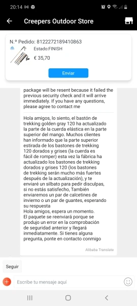Хороший продукт, но некоторые расхождения. 53 дня в Монреаль Канаду. • Я заказал 2 модели E4102 (4 секции), я получил 2 модели E4201 (3 секции). • Я заказал 2 разных размера (1x110 см и 1x120 см), я получил только 1 сумку. • 2 поставляемых «кольца снега» бесполезно (они относятся к другой модели), модель «3 секции» не предоставляет каких-либо дополнений или модификации наконечника. • Модель «3 секции» имеет фиксированное (несъемное) Мини-кольцо, поэтому невозможно иметь простой прямой наконечник, который предпочтителен при использовании в качестве болотного полюса. Тем не менее, полученная мной модель по-прежнему хороша, если не лучше, нет шнура на внешней стороне ручки. Отличное качество, выглядит отлично, Супер Легкий и шнур внутри... хорошо ...int eresting... Спасибо.