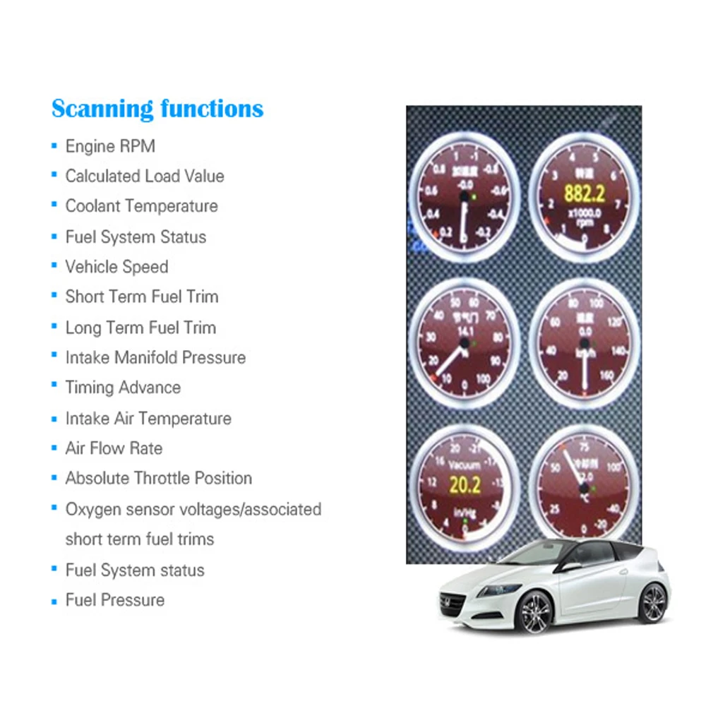 Он совместим со всеми спецификациями OBD II / EOBD. Различные модели беспроводного подключения для подключения вашего смартфона или планшета. Он считывает данные автомобильного двигателя в режиме реального времени, такие как скорость двигателя, время зажигания, обшивка топлива, температура воды, расход топлива, он поддерживает различные приложения OBD II.