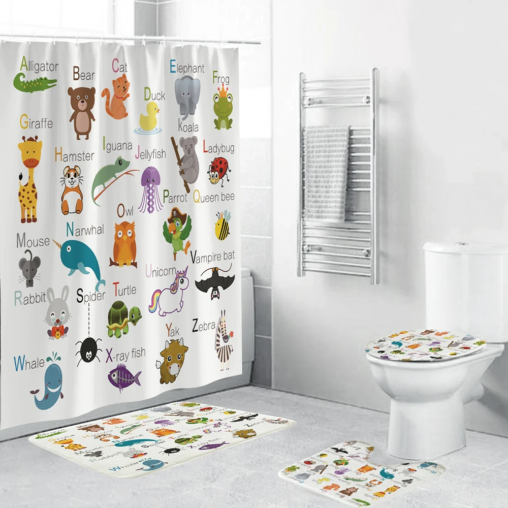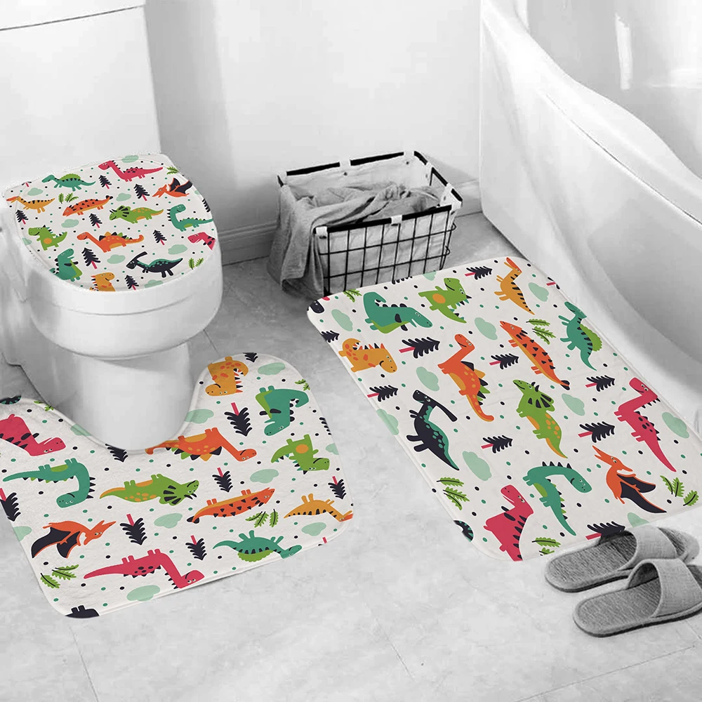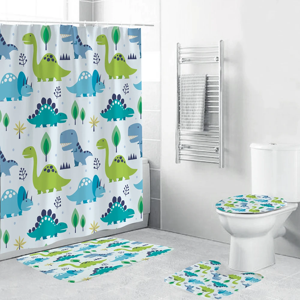 Занавеска для душа с мультяшным динозавром для детей, набор из 4 предметов с принтом животных для ванной комнаты, мягкий коврик для унитаза, украшение для ванной комнаты