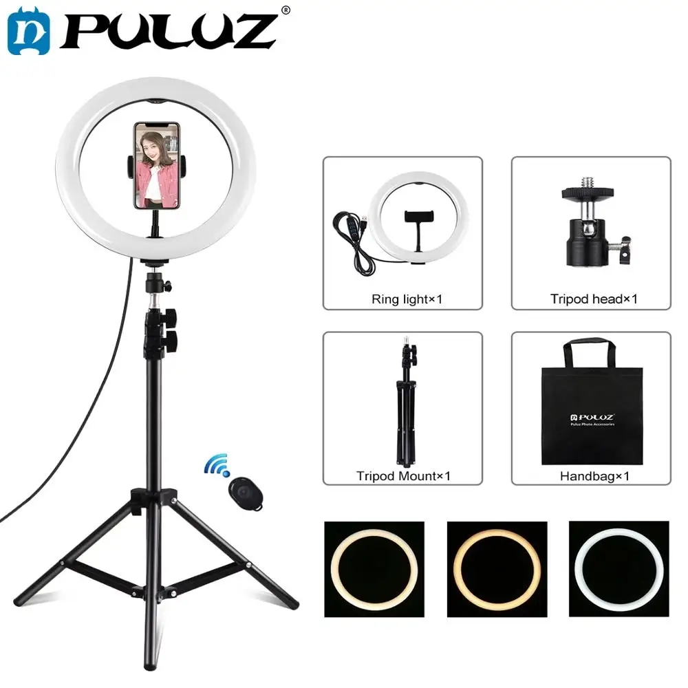 Кольцевой светодиодный светильник для селфи PULUZ, 10,2 дюйма, 26 см, USB, 3 режима, с регулируемой яркостью, лампа для видеосъемки YouTube и штатив 1,1 м, наборы для прямой трансляции