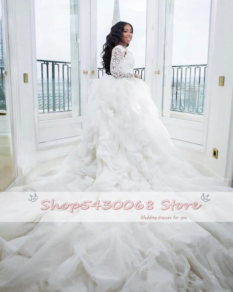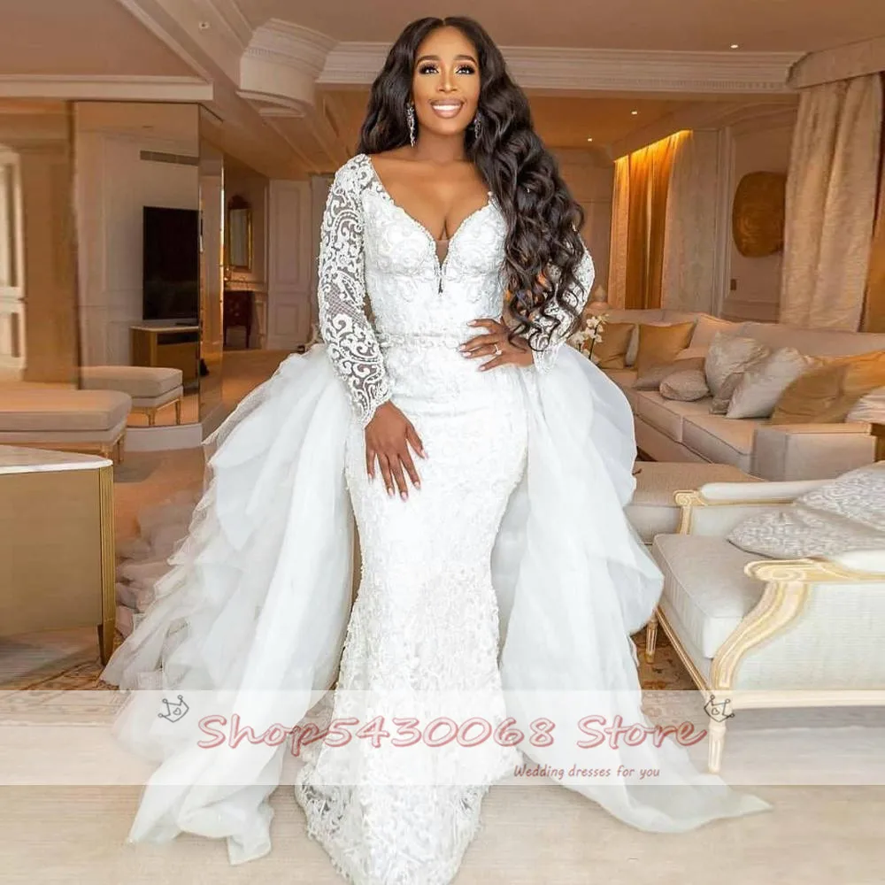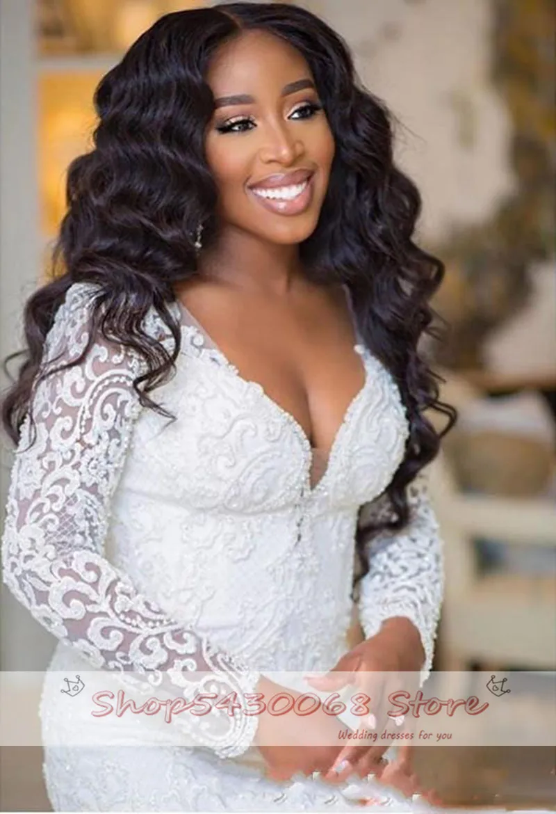 Роскошное свадебное платье в африканском стиле с длинным рукавом и юбкой-годе, с открытым шлейфом, сексуальные черные кружевные свадебные платья с глубоким V-образным вырезом для девушек