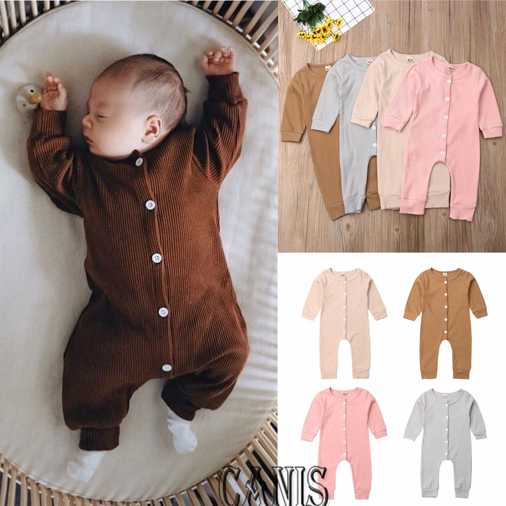Комбинезон для новорожденных мальчиков и девочек, однотонный хлопковый комбинезон на пуговицах с длинным рукавом, Детский костюм