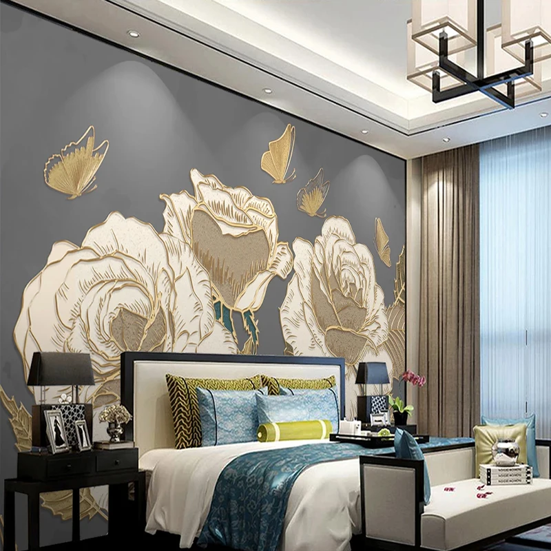 Настенная роспись на заказ, красивые обои из шелковой ткани с золотым рельефом, розой, бабочками, фоном для гостиной, ТВ, домашний декор, фреска