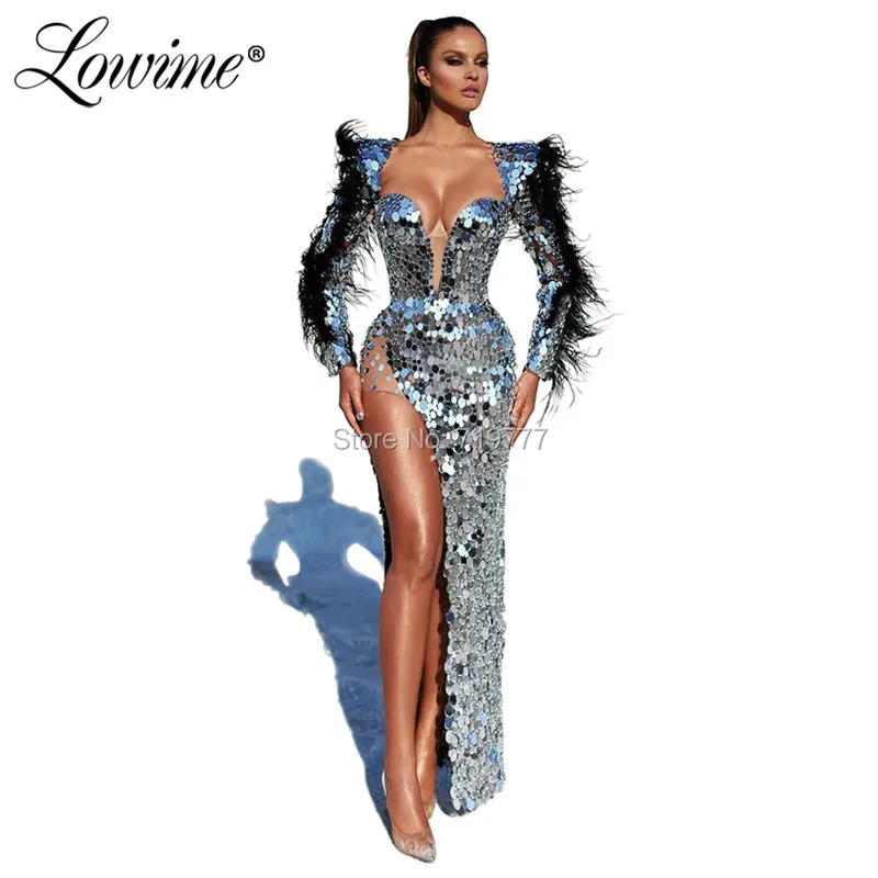Черные перья сверкающие блестки турецкие кафтаны с высоким разрезом сбоку Русалка халат для вечеринки Aibye 2020 платья женские вечерние ночные платья