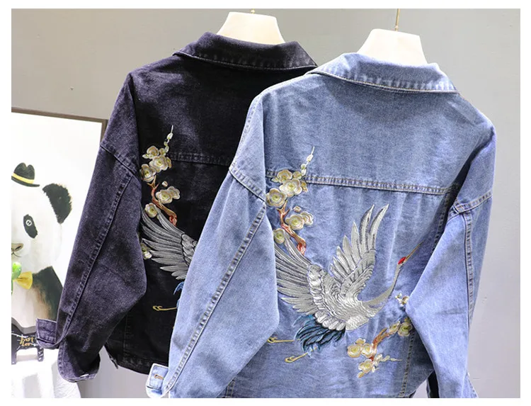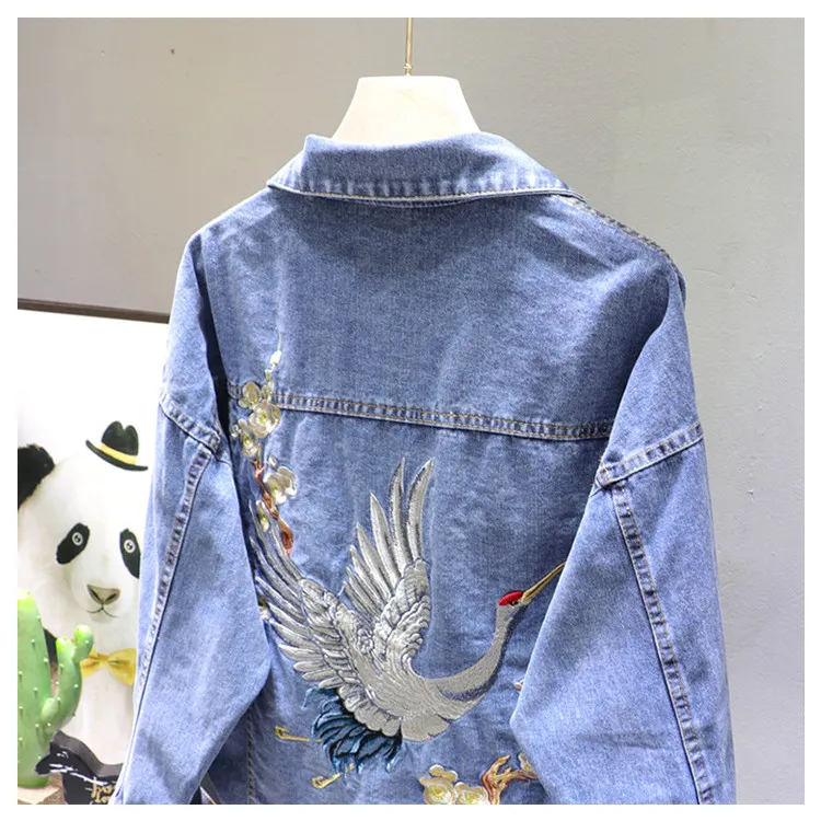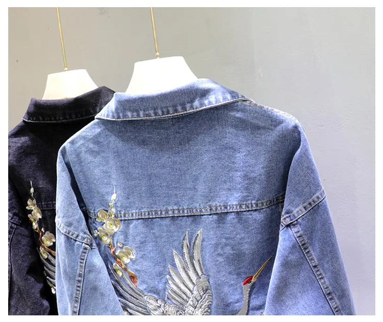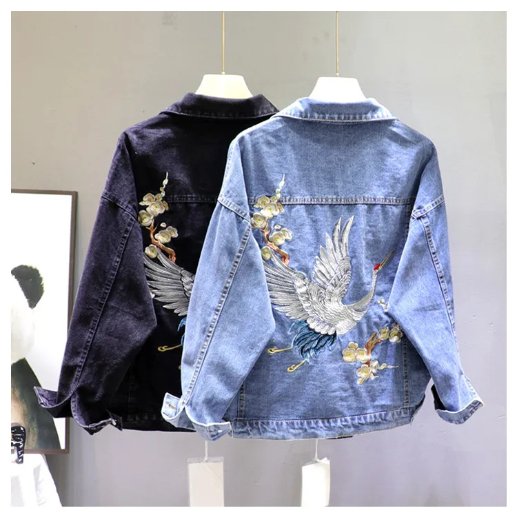 Женская джинсовая куртка с вышивкой, черная Свободная джинсовая куртка с маленьким журавлем, модель H107 на весну, 2020