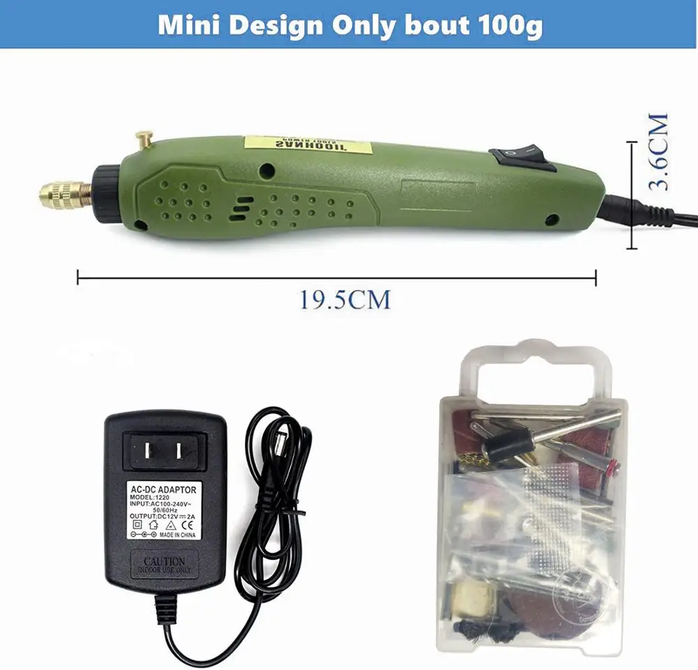 Это профессиональный инструмент для резки, гравировки, фрезерования, шлифования, рисования, обрезки, полировки, удаления и сверления. Он предназначен для применения нержавеющей стали, фарфора, камня, стекла, пластика, дерева, алюминия подарок, браслет и т. Д.Особенности:Набор гравировки шлифовальной машины необходим для самостоятельной резьбы и шлифования.Этот электрический резной инструмент имеет очень мини-шлифовальный корпус, удобный в использовании.Подходит для Нефритового агата с резьбой по дереву.Электрическая портативная дрель, прочная и надежная.Небольшой объем, вес, легкий светильник, удобная ручка.Для шлифовки алюминиевой пластины, тонкой медной доски, пластиковой доски, ДСП, печатной платы, эпоксидной доски.Идеальная электрическая шлифовальная машина для резки, гравировки, фрезерования, шлифования, полировки, удаления и сверления.Примечание; Этот товар неБеспроводная электрическая дрель.