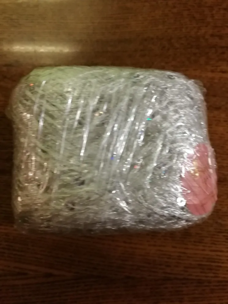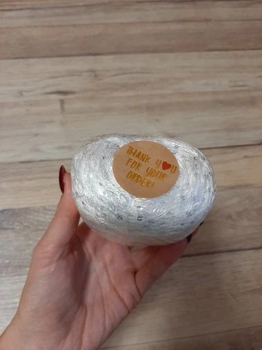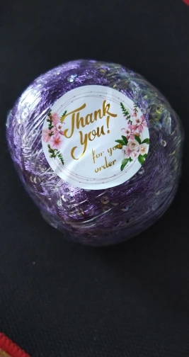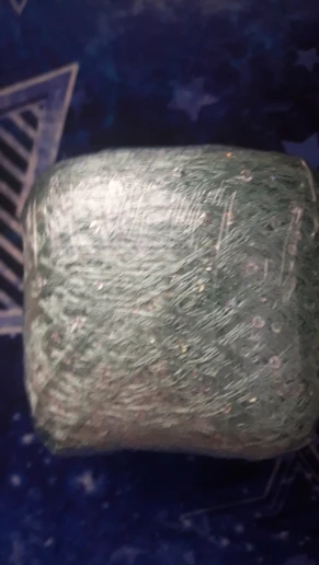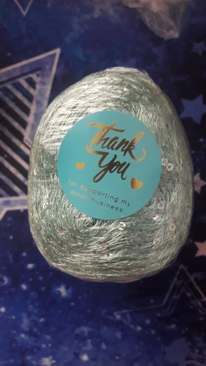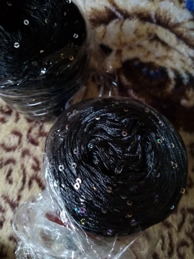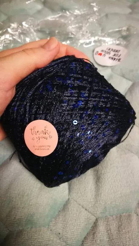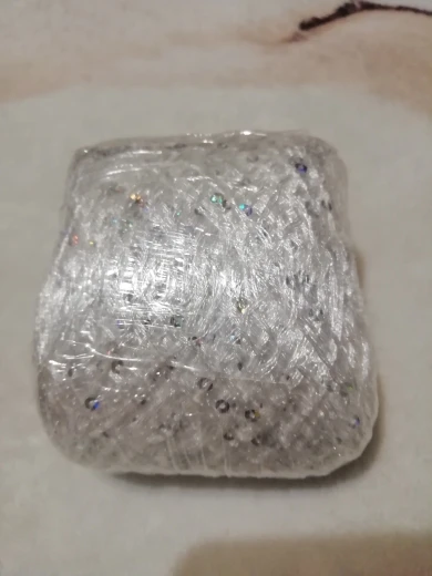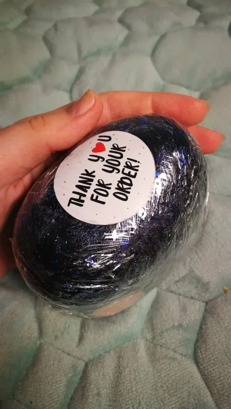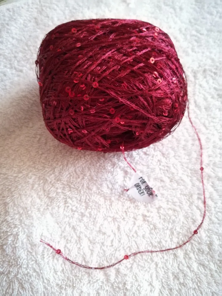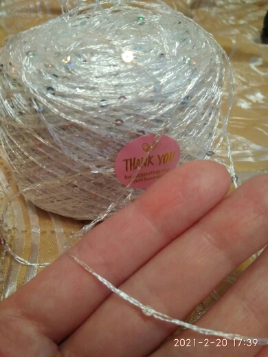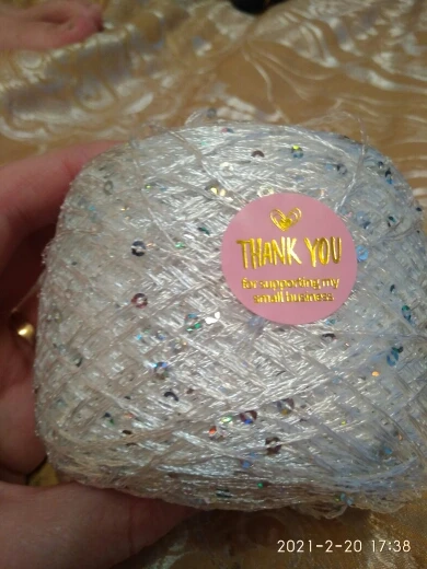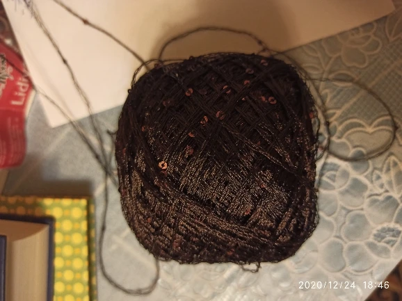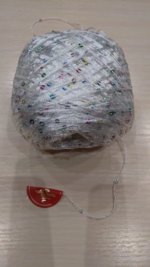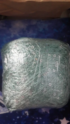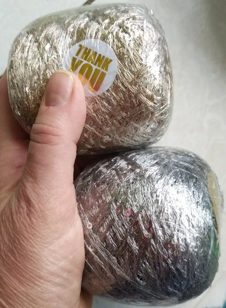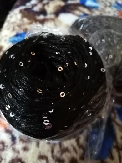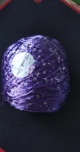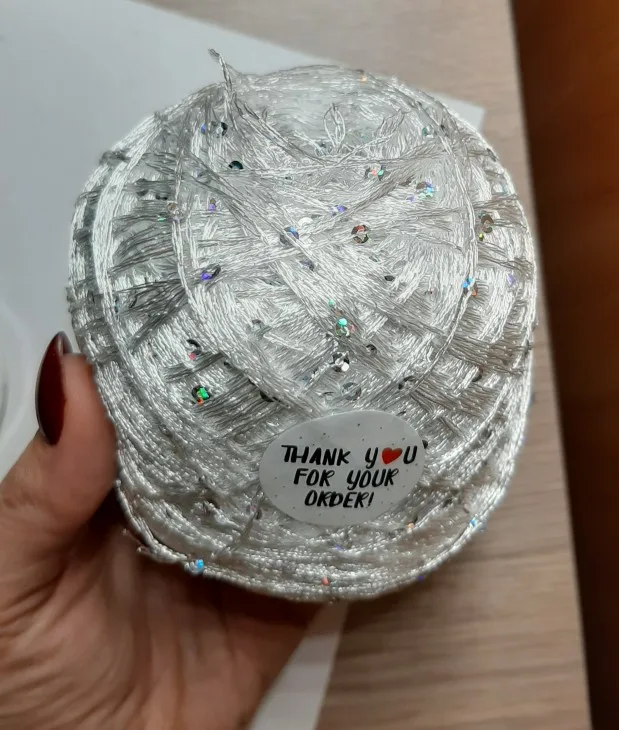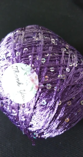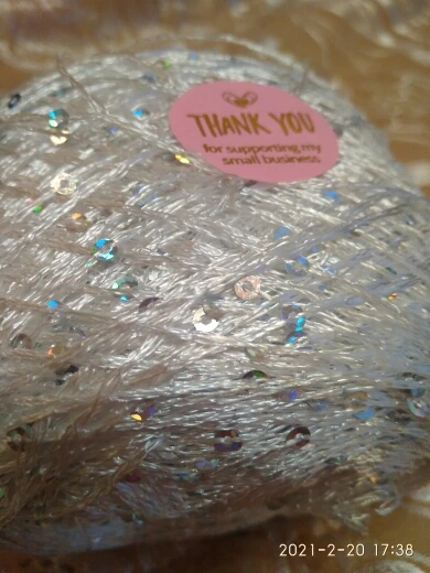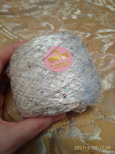 Ниточка отличная с мелкими пайетками. Нить сплетена шнуром и вплетены пайетки. Хорошо упакована, чтобы не рассыпалась в процессе вязания. Начальный кончик из центра клубка оклеен этикеткой, что тоже весьма удобно, учитывая, что нить шелковистая.
