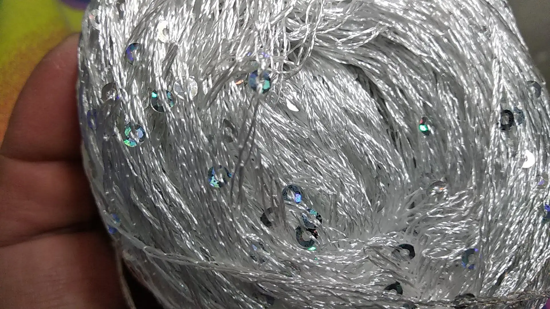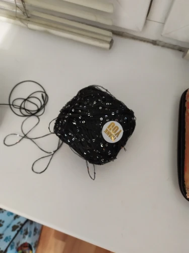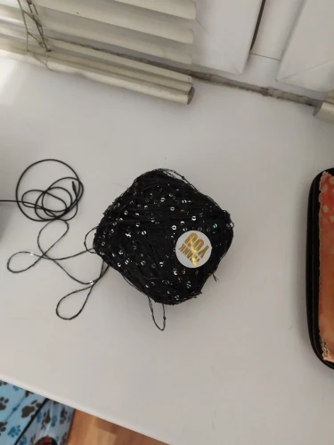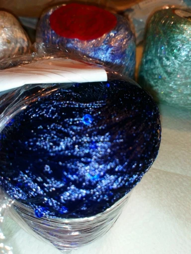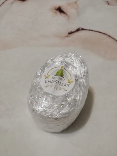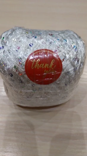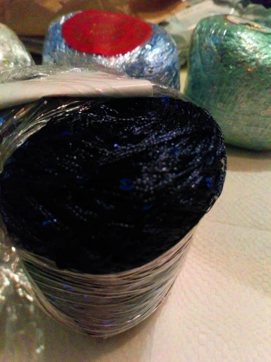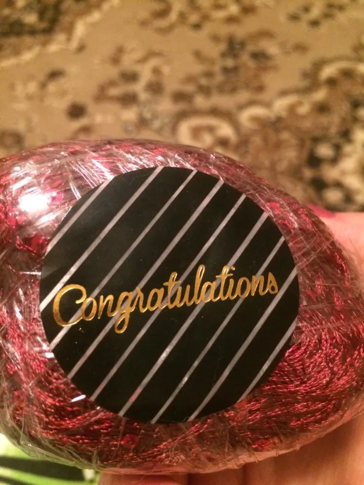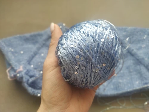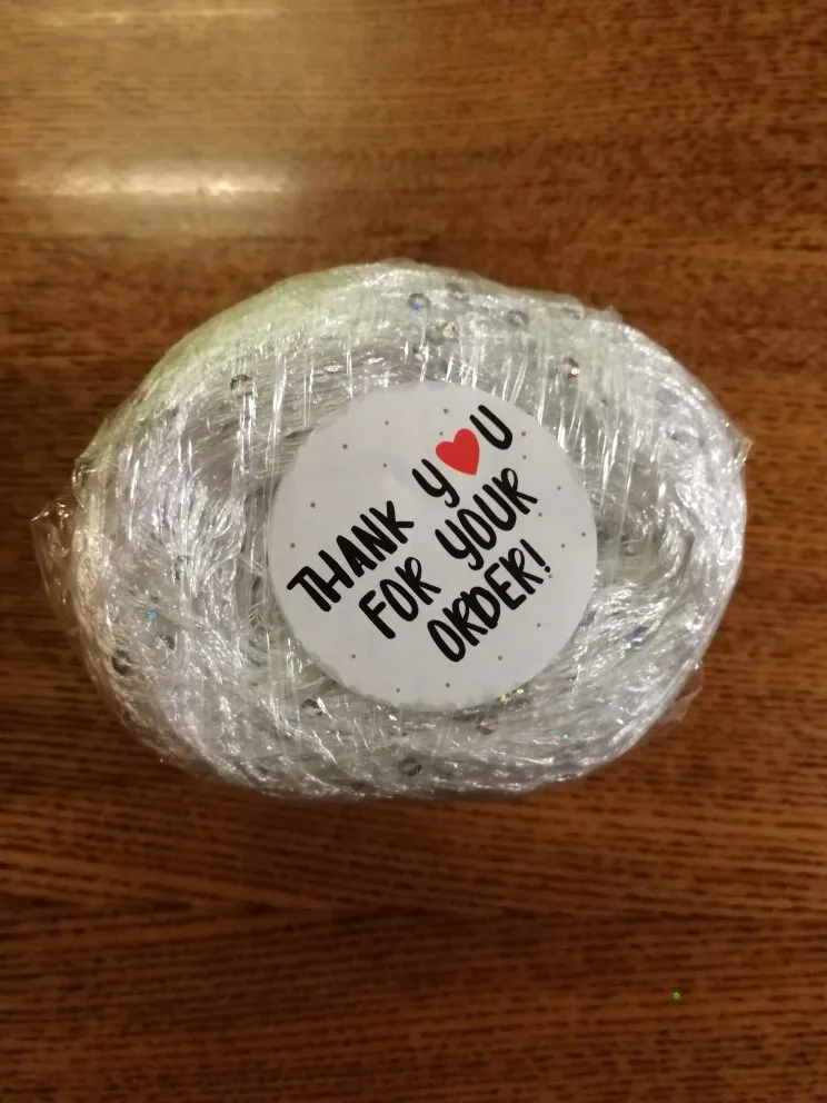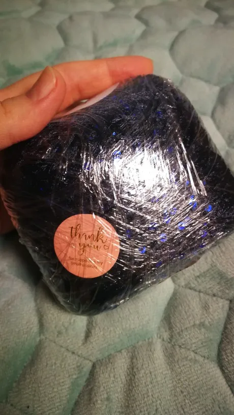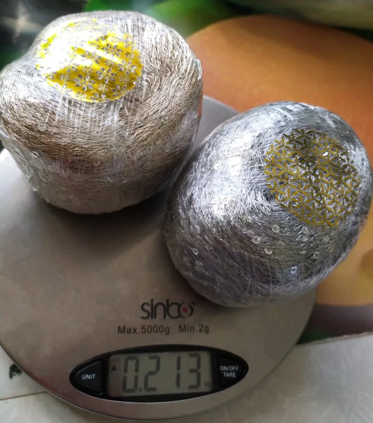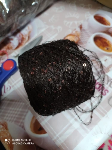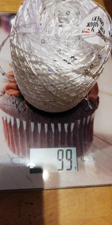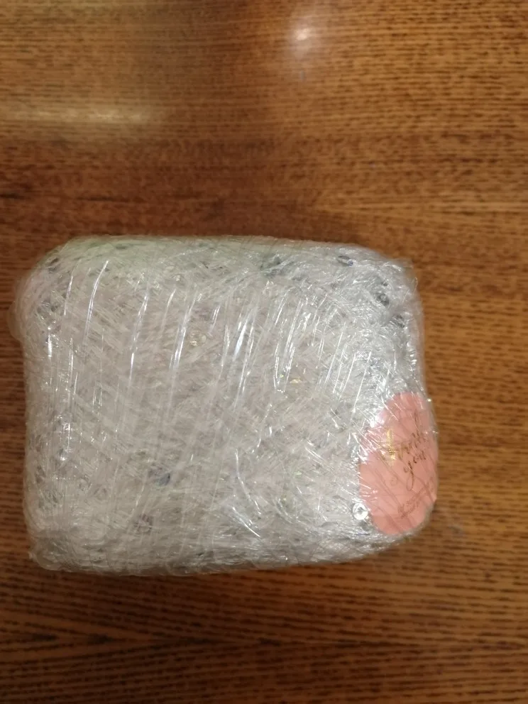 Ниточка отличная с мелкими пайетками. Нить сплетена шнуром и вплетены пайетки. Хорошо упакована, чтобы не рассыпалась в процессе вязания. Начальный кончик из центра клубка оклеен этикеткой, что тоже весьма удобно, учитывая, что нить шелковистая.