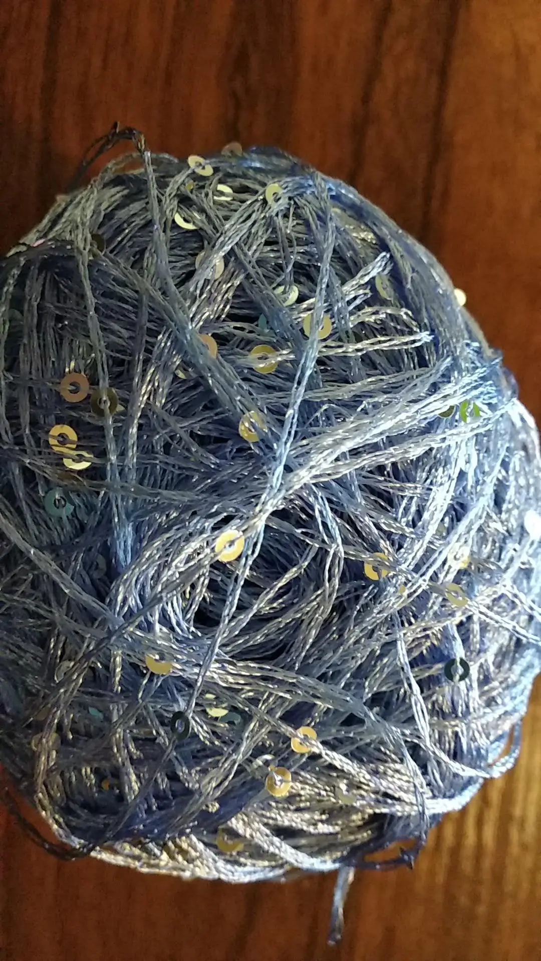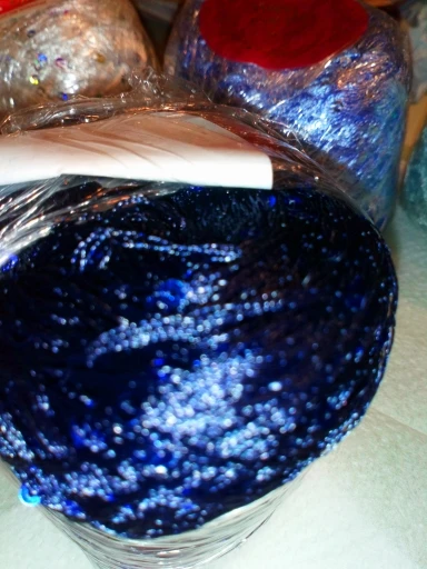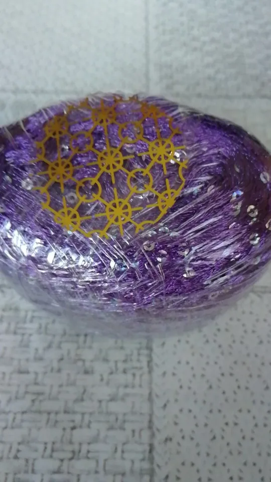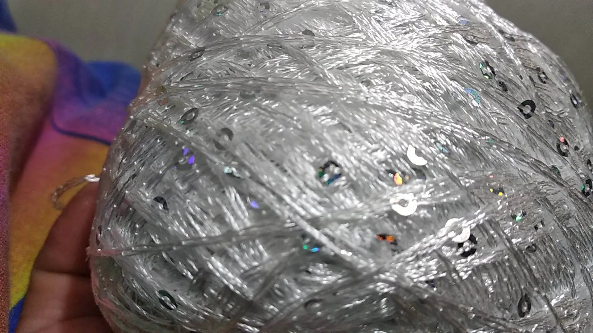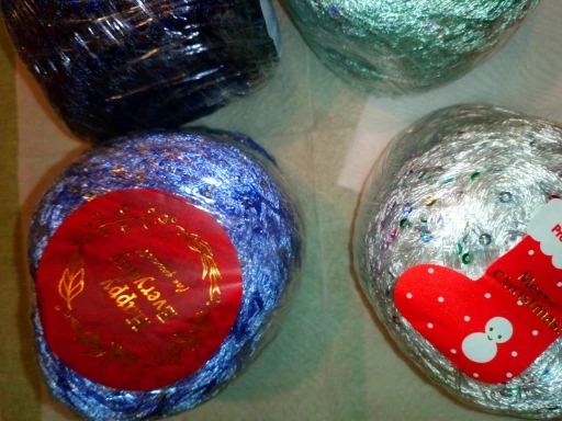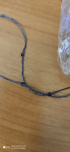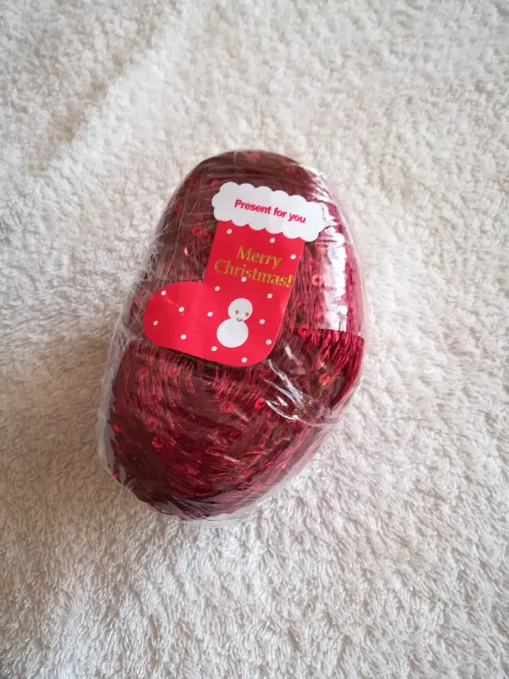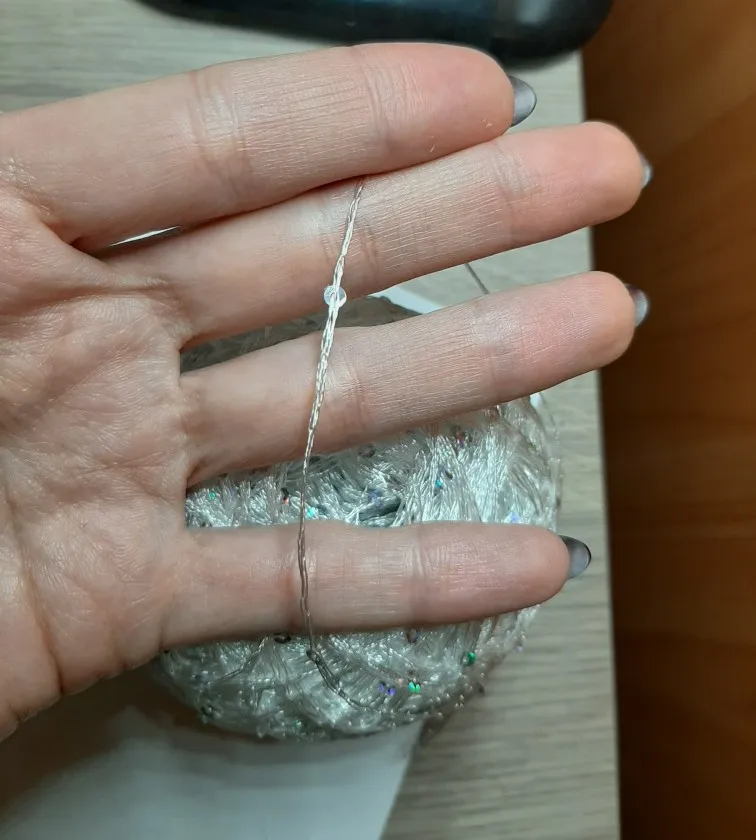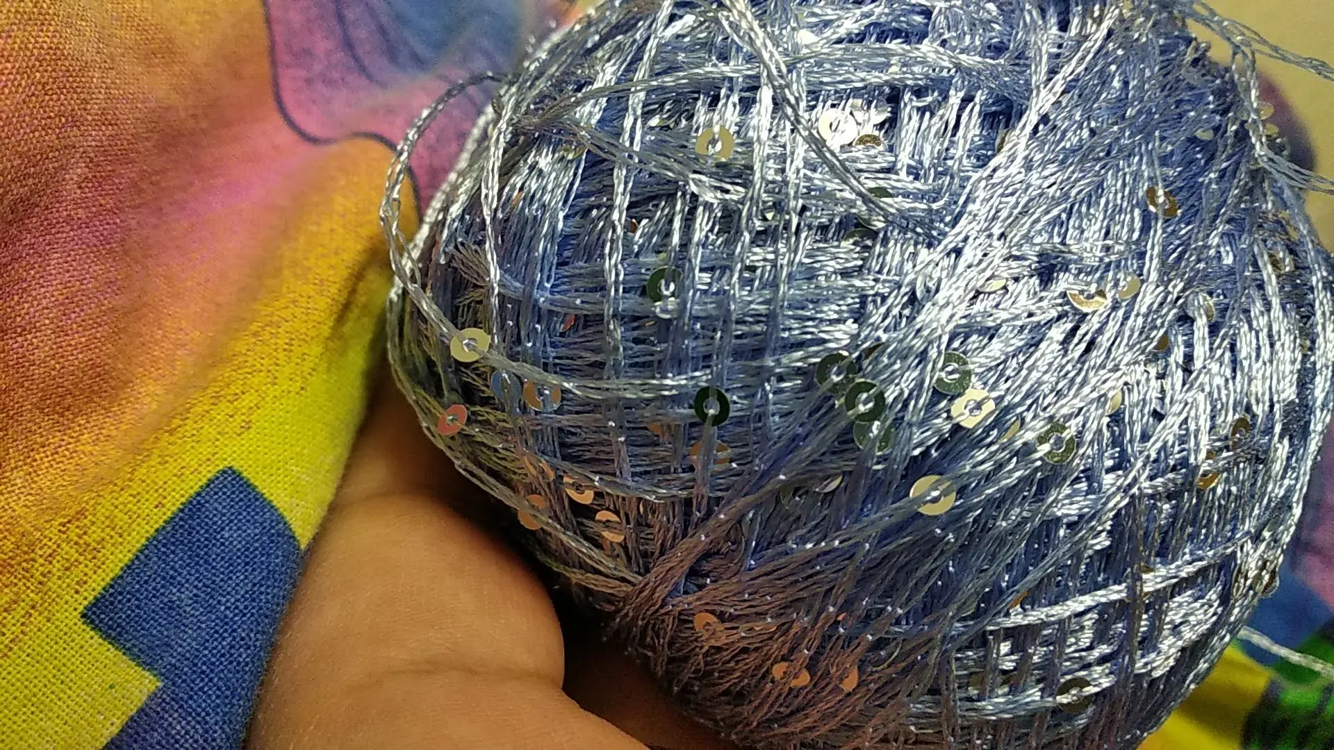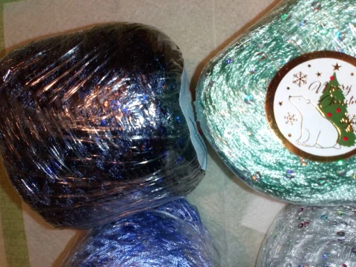 Ниточка отличная с мелкими пайетками. Нить сплетена шнуром и вплетены пайетки. Хорошо упакована, чтобы не рассыпалась в процессе вязания. Начальный кончик из центра клубка оклеен этикеткой, что тоже весьма удобно, учитывая, что нить шелковистая.