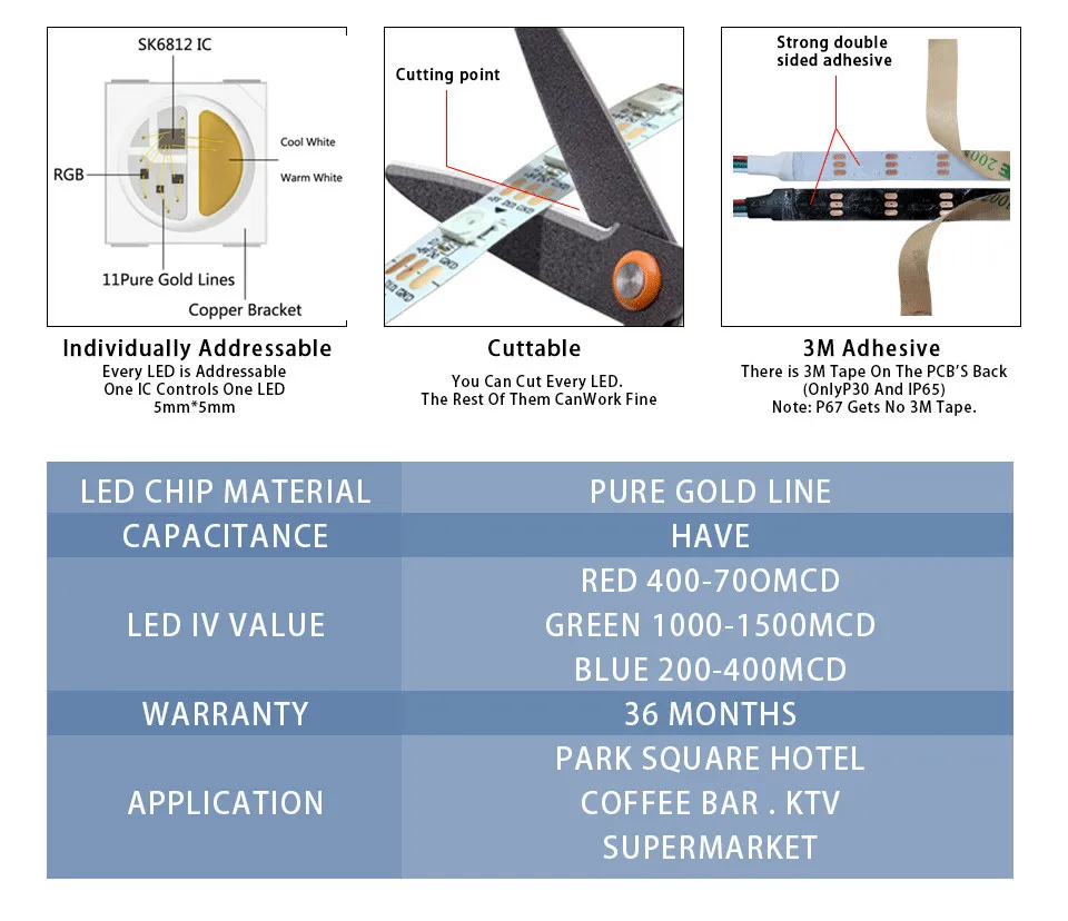 11. Полоса IP30/IP65 имеет двустороннюю клейкую ленту на спине, полоса Ip67 не имеет двойного клея на спине, поверхность установки должна быть гладкой, чистой и сухой