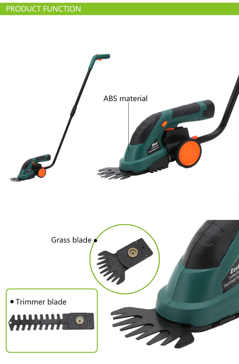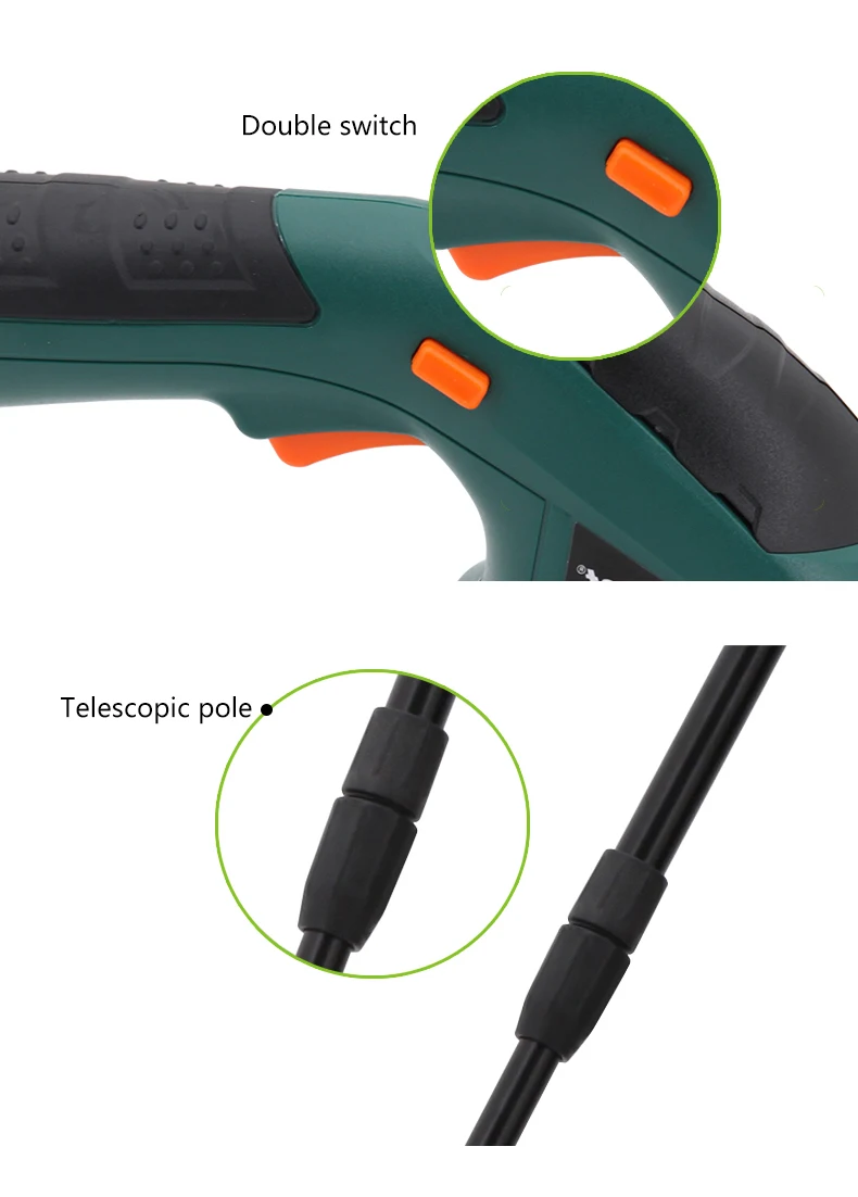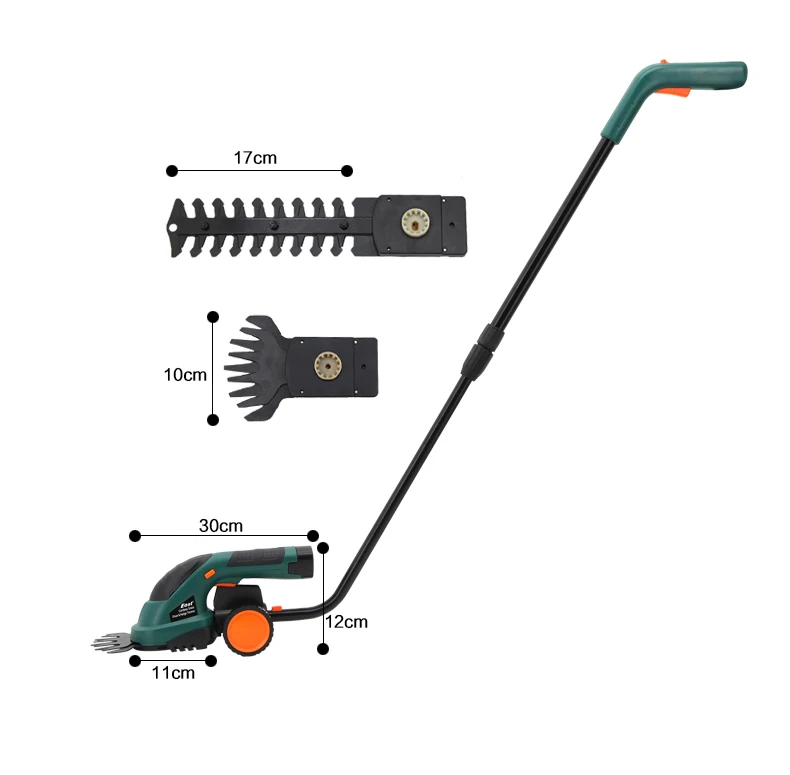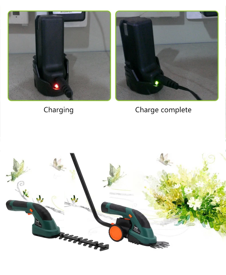 Спецификация:Напряжение аккумулятора: 7,2 В постоянного токаЛезвие: 100 мм; Ширина реза для ножницЛезвие: 170 мм; Длина резки кустарникаВремя зарядки: 4 часаАлюминиевая телескопическая ручка (580-900 мм)Материал лезвия: 65Mn, черный оксидАккумулятор: 1300 мАч, литиевый,Вращающаяся режущая головка для кромкиЭта машина с одним зарядным устройством, двумя черными лезвиями, съемными колесами и валом.