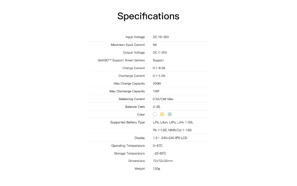 Входное напряжение: 10-30 В постоянного токаМаксимальный входной ток: 9AВыходное напряжение: 1-30 В постоянного токаТок зарядки: 0.1A-8.0AТок разряда: 0.1A-1.0AМаксимальная емкость зарядки: 200 ВтМаксимальная емкость разряда: 10 ВтБаланс тока: 0.5A/Cell MaxБаланс клеток: 2-6SЦвет: зеленый/белый/желтыйПоддержка батареи: срок службы, Лев, липо, LiHV:1-6SPb: 1-12SNiMH: 1-16SДисплей: 1,5 "240X24 0 IPS LCDРазмер: 72x72x32ммВес: 120 гВ комплект входит: