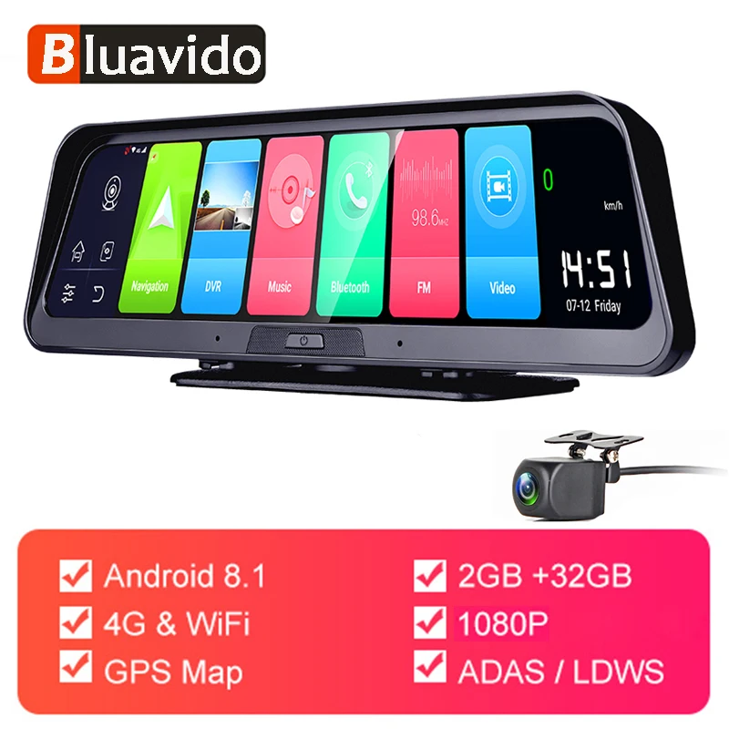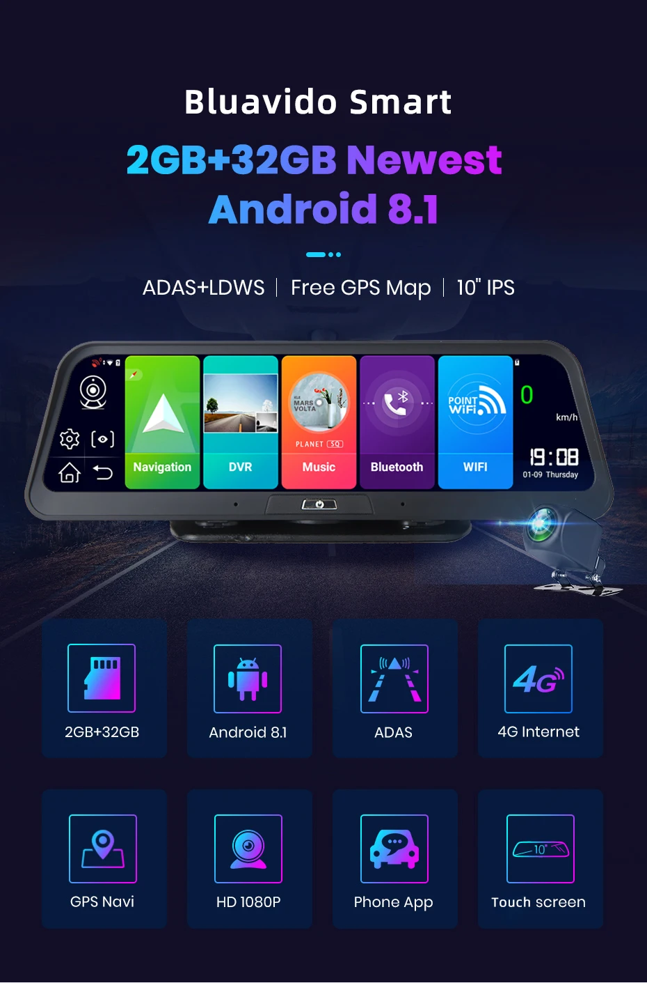 Зеркало-видеорегистратор Bluavido ADAS, 4G, 10 дюймов, IPS, GPS, FHD 1080P, двойной объектив, ночное видение, дистанционное управление