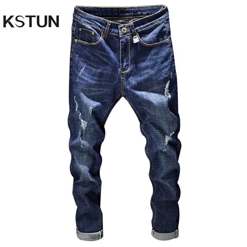 Мужские рваные джинсы KSTUN, темно-синие эластичные штаны, уличная ...