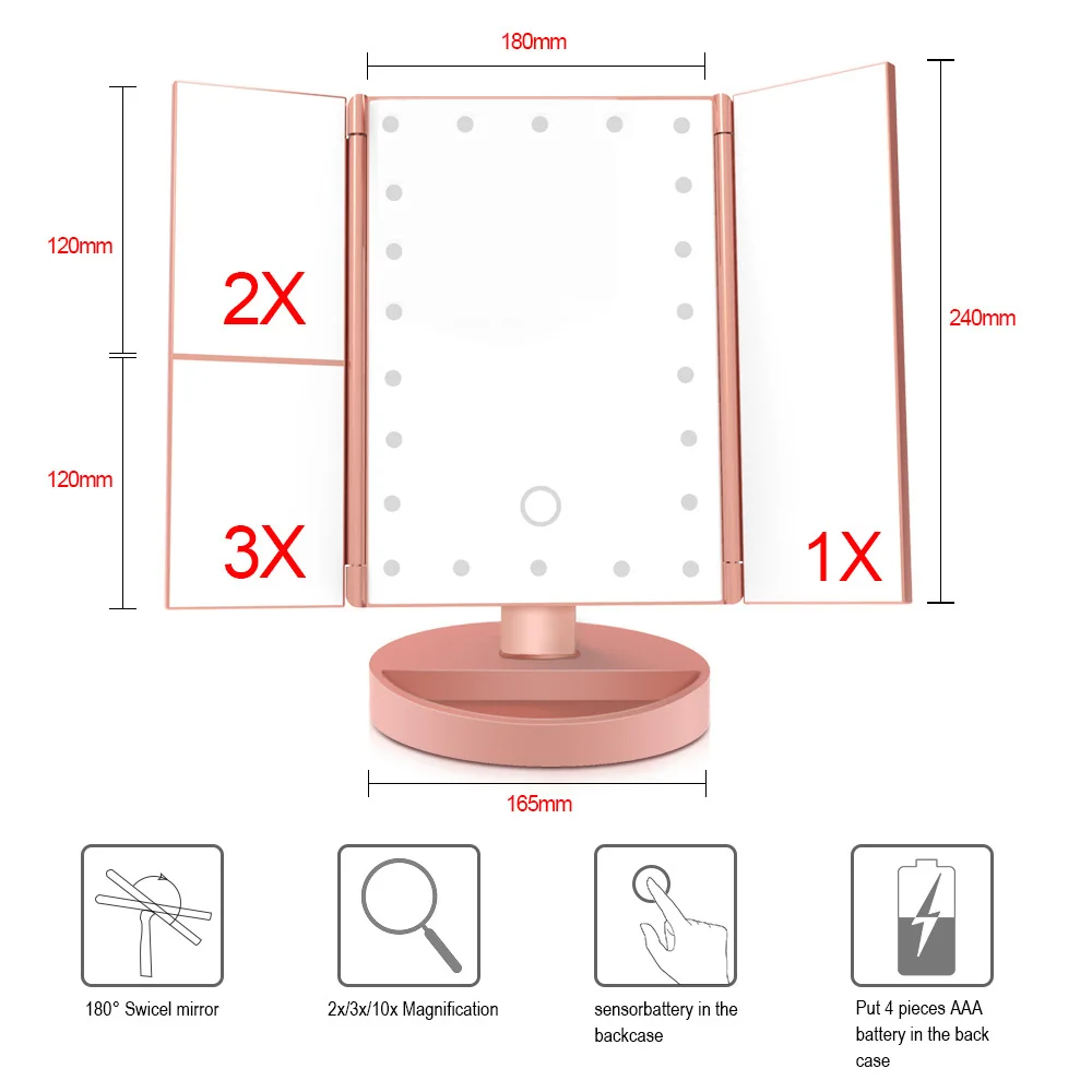 1. Сенсорное открытие 22 СВЕТОДИОДНЫХ ламп. Свет равномерно освещается, чтобы обеспечить идеальное зеркальное отображение в условиях низкого освещения.