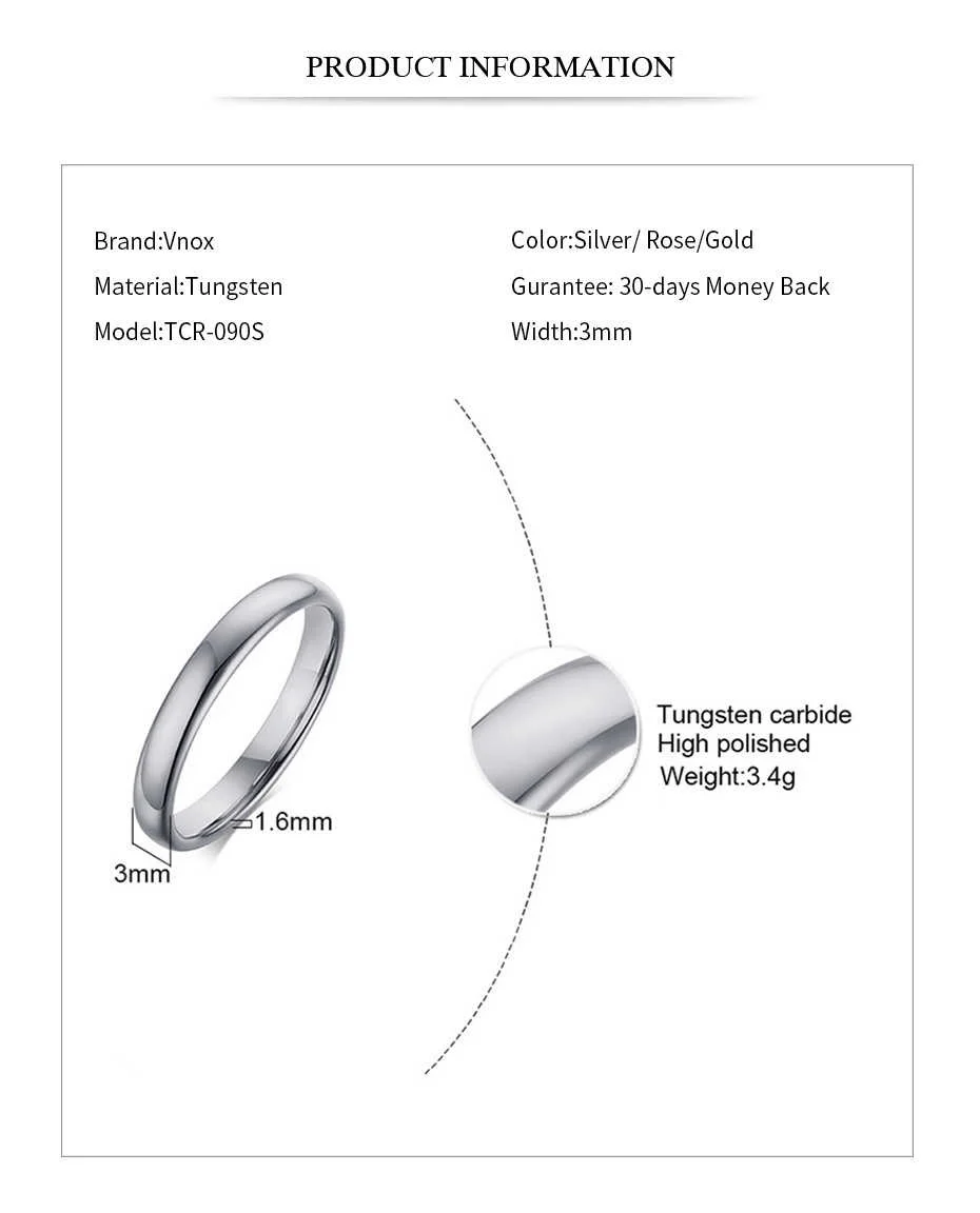 Vnox 100% Вольфрам кольцо для Для мужчин 8 мм Свадебные Классически...