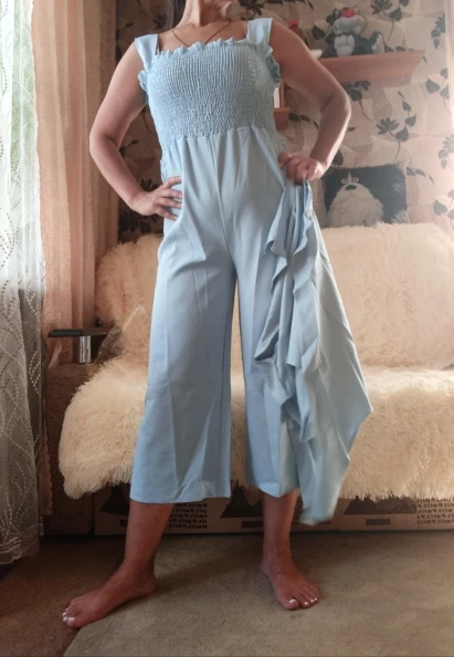 Привет. Получила комбинезончик с пиджачком, очень понравился, пошит хорошо, ткань плотненькая, цвет голубой, красивый, стирается хорошо, но нужно гладить, очень мятый. Я покупала на параметры 94см- 76см- 98см, рост 159 см, поэтому он хорошо подошел. Если выше рост, то он с такими параметрами был бы мал, так как на худеньких и высоких- костюм вытягивается, а на мои параметры он немного в ширь пошёл)))... На фото костюм сразу после получения. Отгладится и будет красивым. Спасибо за костюм.