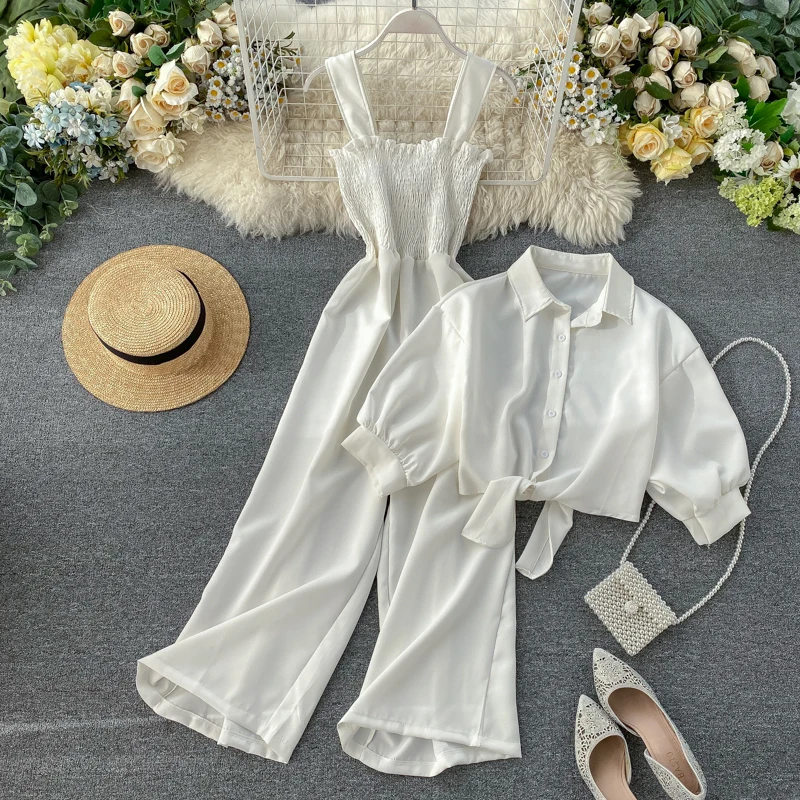 Женский костюм-двойка с короткой курткой и подтяжками, лето
