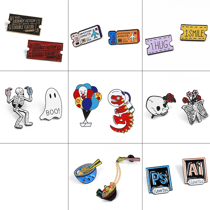 2 шт.компл. Мультяшные эмалевые Броши билет PS лапша динозавр панк череп роза Скелет эмаль значки на лацкан милые женские ювелирные изделия
