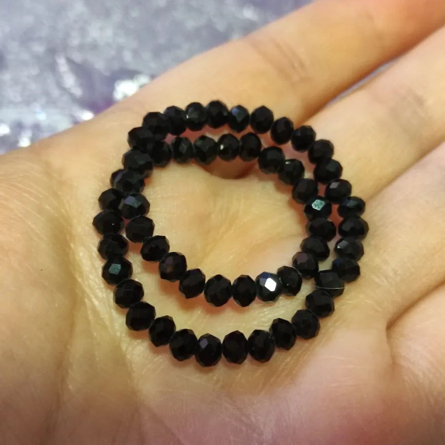 Действительно маленькие круглые бусины, обсидиан, я думаю, это действительно. Диаметр довольно большой для меня (Моя костная структура узкая), поэтому я рекомендую для тех, у кого средние запястья.