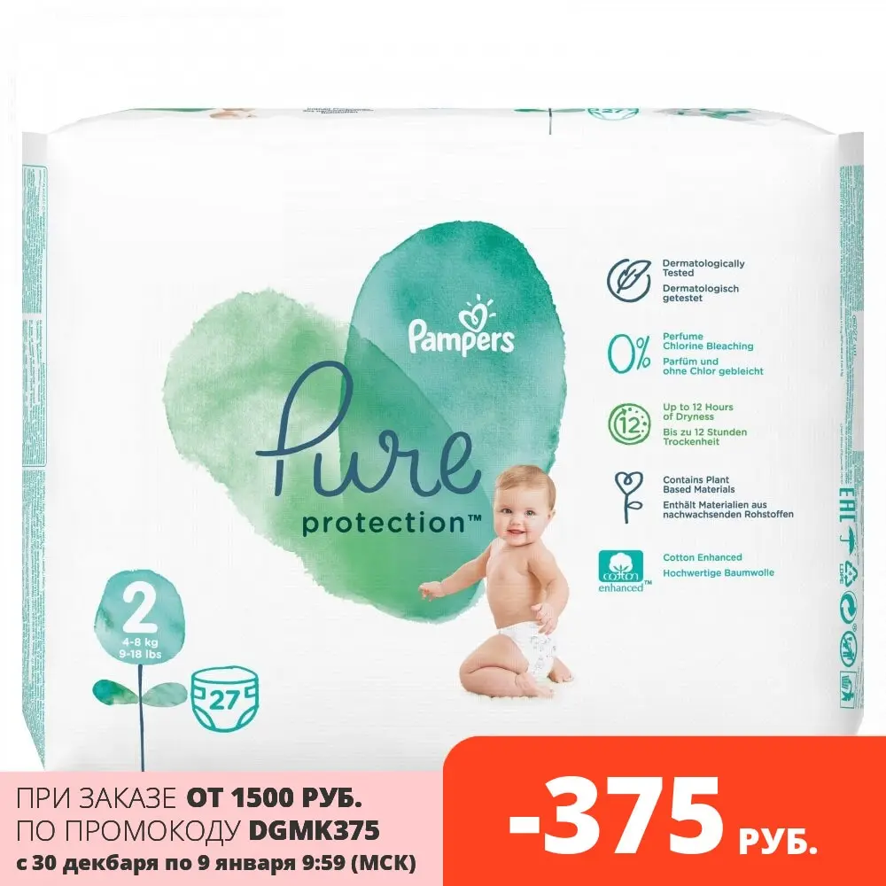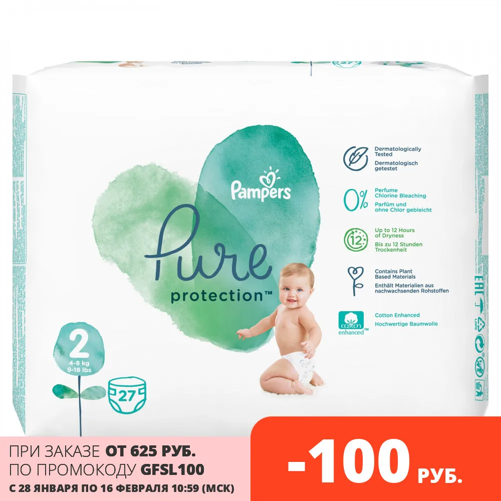 Подгузники Pampers Pure Protection 4-8 кг, размер 2, 27 шт.