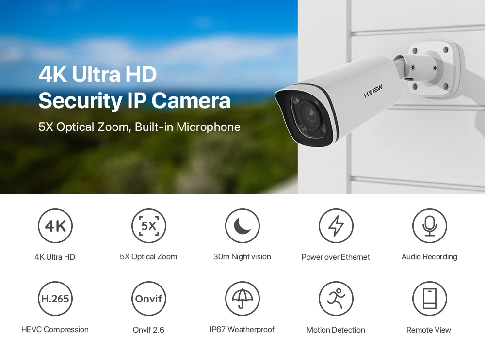 H.View 4K Ultra HD POE ip-камера имеет разрешение пикселей 3840x2160, доставка более высокого качества изображения. Лучше в деталях.