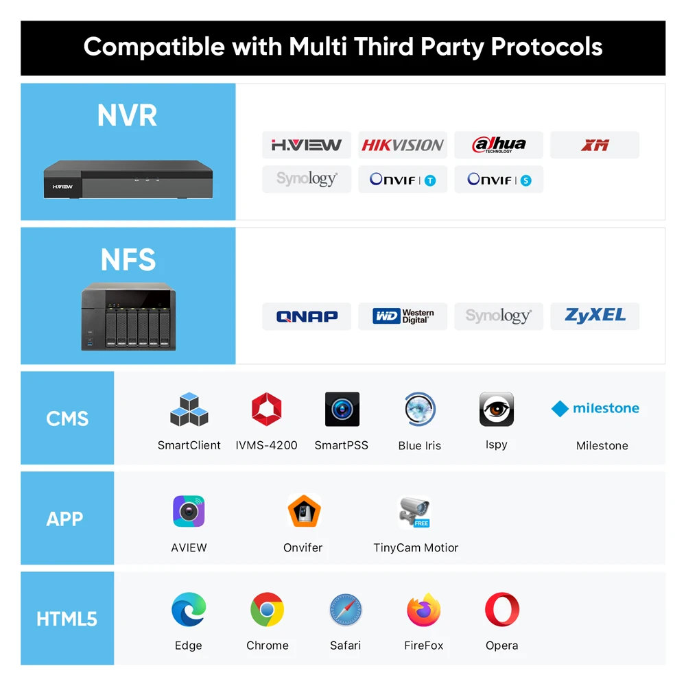 Подключи и играй с H.VIEW NVR, поставляется с протоколами конфиденциальности, хорошо работает с NVR Hikvision и NVR Dahua. Сохраните записи в Synology и QNAP NAS Station.