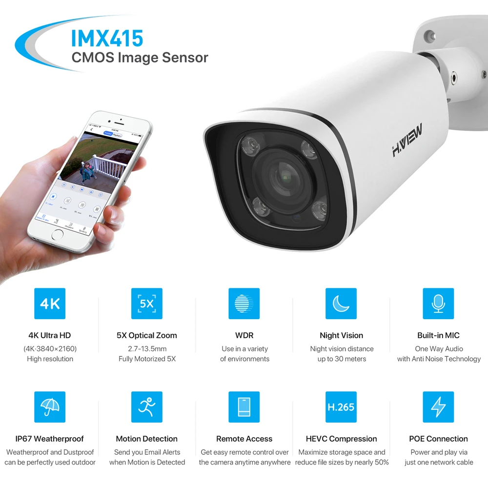H.View 4K 8MP Poe Ip камера H.265 5X оптический зум пуля наружная Водонепроницаемая CCTV камера видеонаблюдения камера для Poe Nvr Onvif
