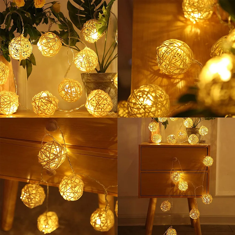 Идеальное Украшение:Эти шаровые гирлянды из ротанга создают теплую и прекрасную атмосферу, создавая ваше место. Идеально подходит для рождества, вечерние, Дня Святого Валентина, Хэллоуина, свадьбы, домашнего декора, окна, спальни, декора штор, фестиваля, праздника, шоу, ресторанов, отелей, торгового центра и т. д.