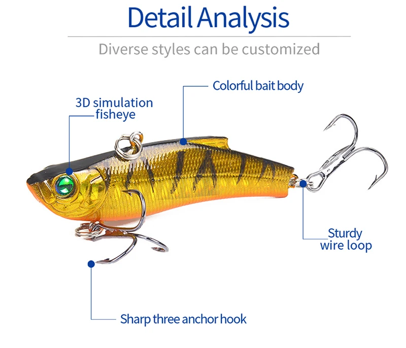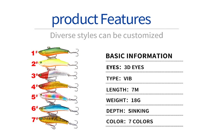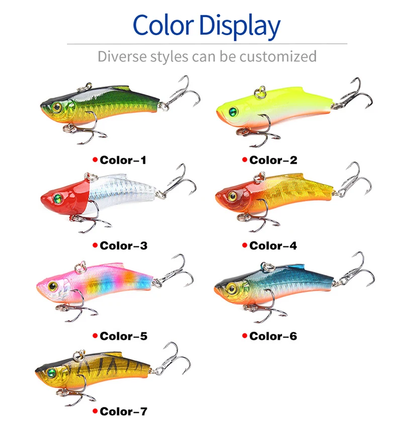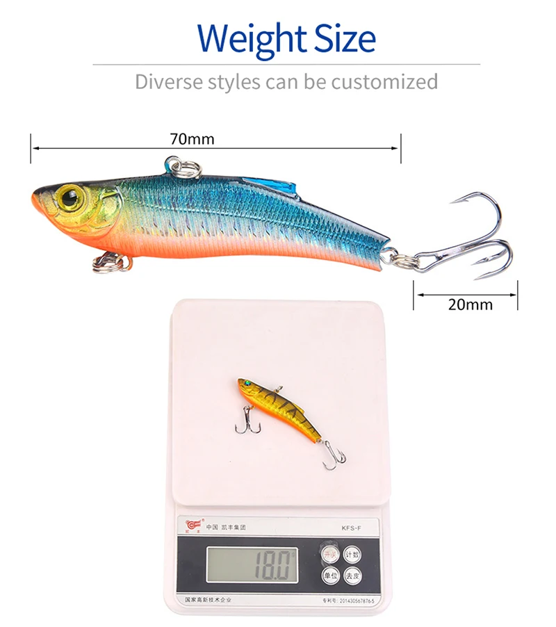 Тип: Искусственная приманка Название продукта: VIB рыболовная приманка Вес: 18 г Длина: 7 см Глубина погружения: опускается на дно Тип крючков: Тройной крюк из высокоуглеродистой стали Цвет: 7 цветов цвет s с 2 рыболовными крючками Материал: АБС-пластик Упаковка: 1 шт. в полиэтиленовом пакете