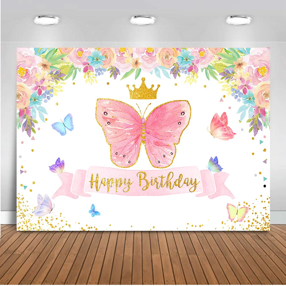 Фон с бабочками для дня рождения, фон для фотосессии, цветы, корона, розовый, для девочек и мальчиков, тематический Декор для дня рождения вечерние фотосессия