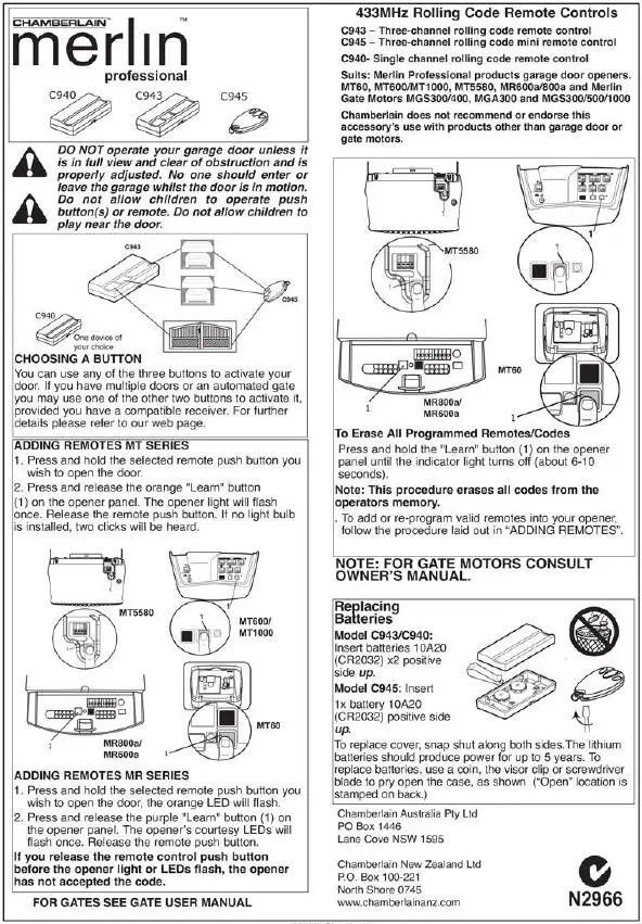 Name1Merlin+ C943 C940 433.92mhz rolling code transmitter